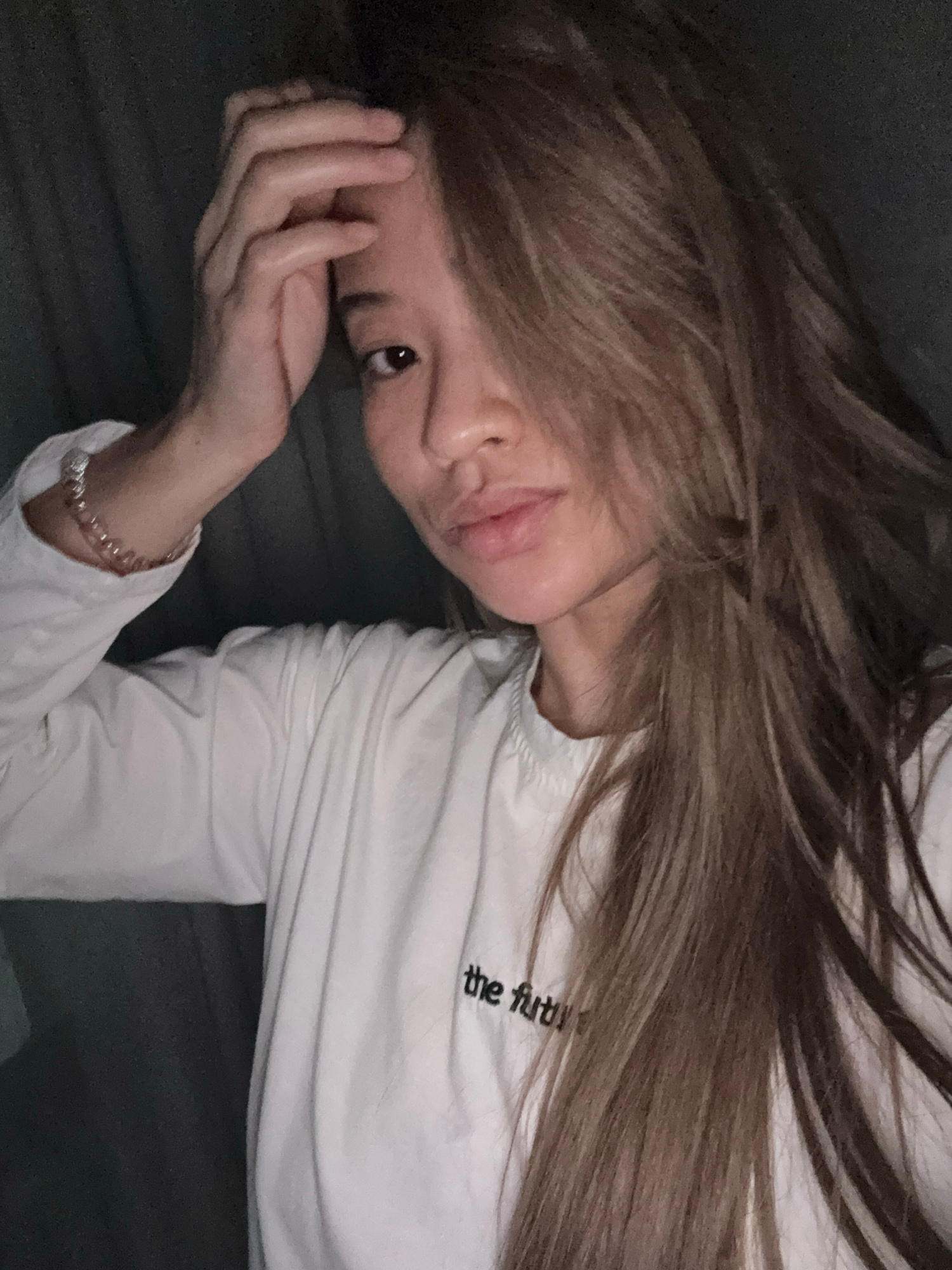 A woman with long brown hair rests her face in her left hand. She is wearing a long-sleeved white shirt with writing on the front. A beaded bracelet adorns her left wrist. The setting appears to be in…read more