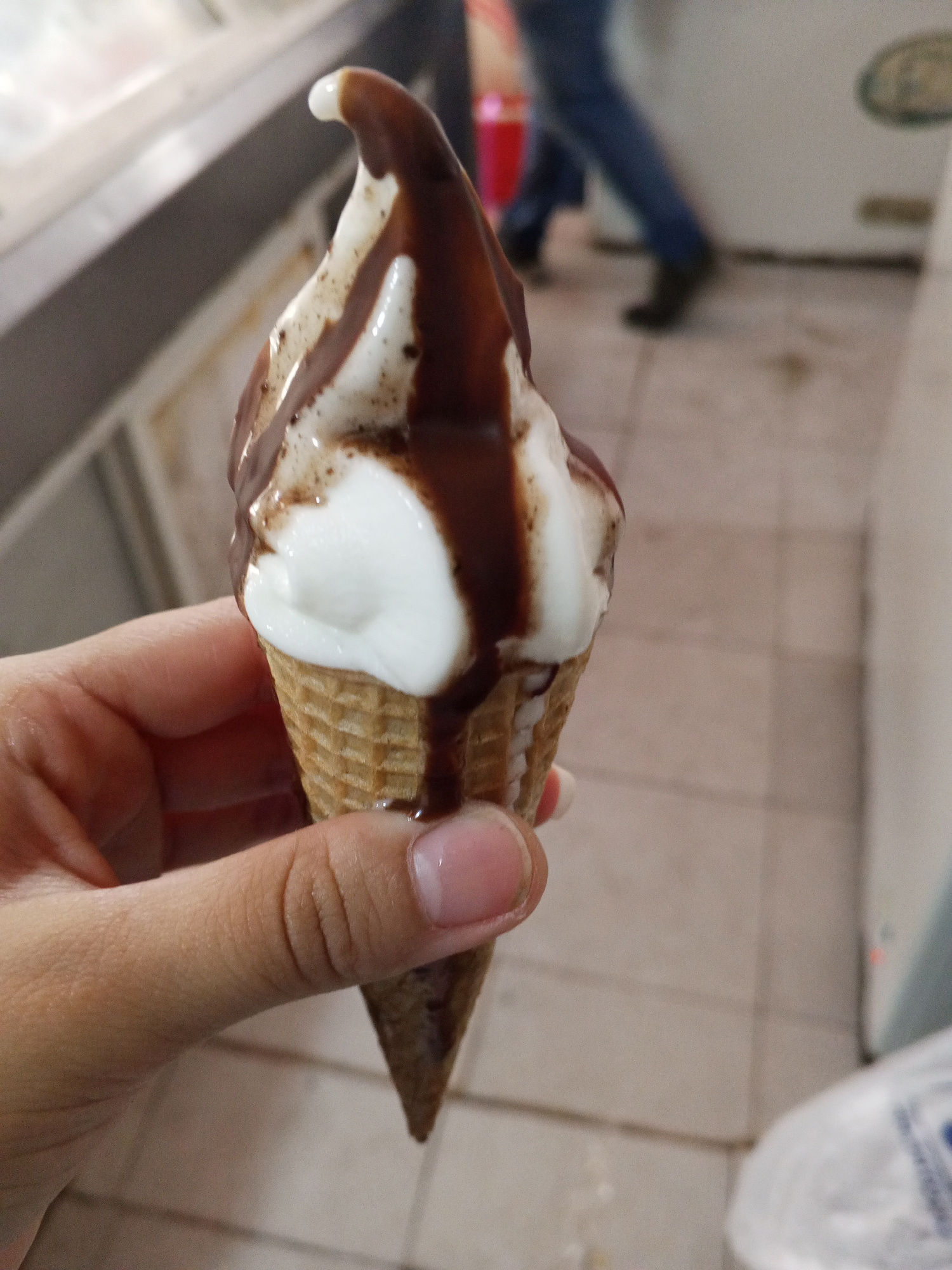 A person is holding an ice cream cone topped with chocolate sauce. The cone is a standard waffle cone filled with vanilla ice cream. The chocolate sauce is drizzled over the ice cream. The person's ha…read more