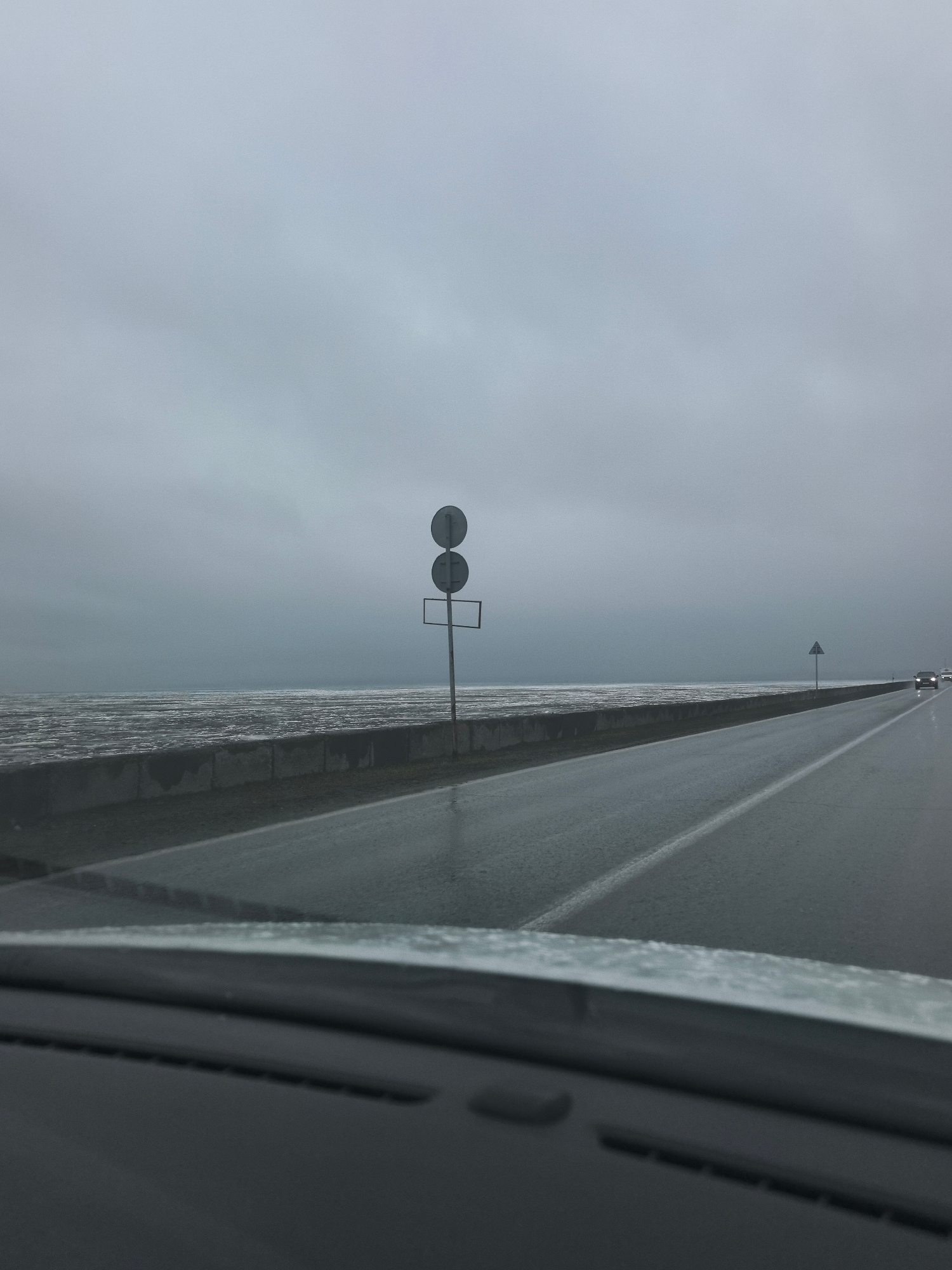 The image captures a road scene from the perspective of a vehicle's dashboard, likely in the Noviy region of Russia. A wet, two-lane highway stretches into the distance under a uniformly overcast, gre…read more