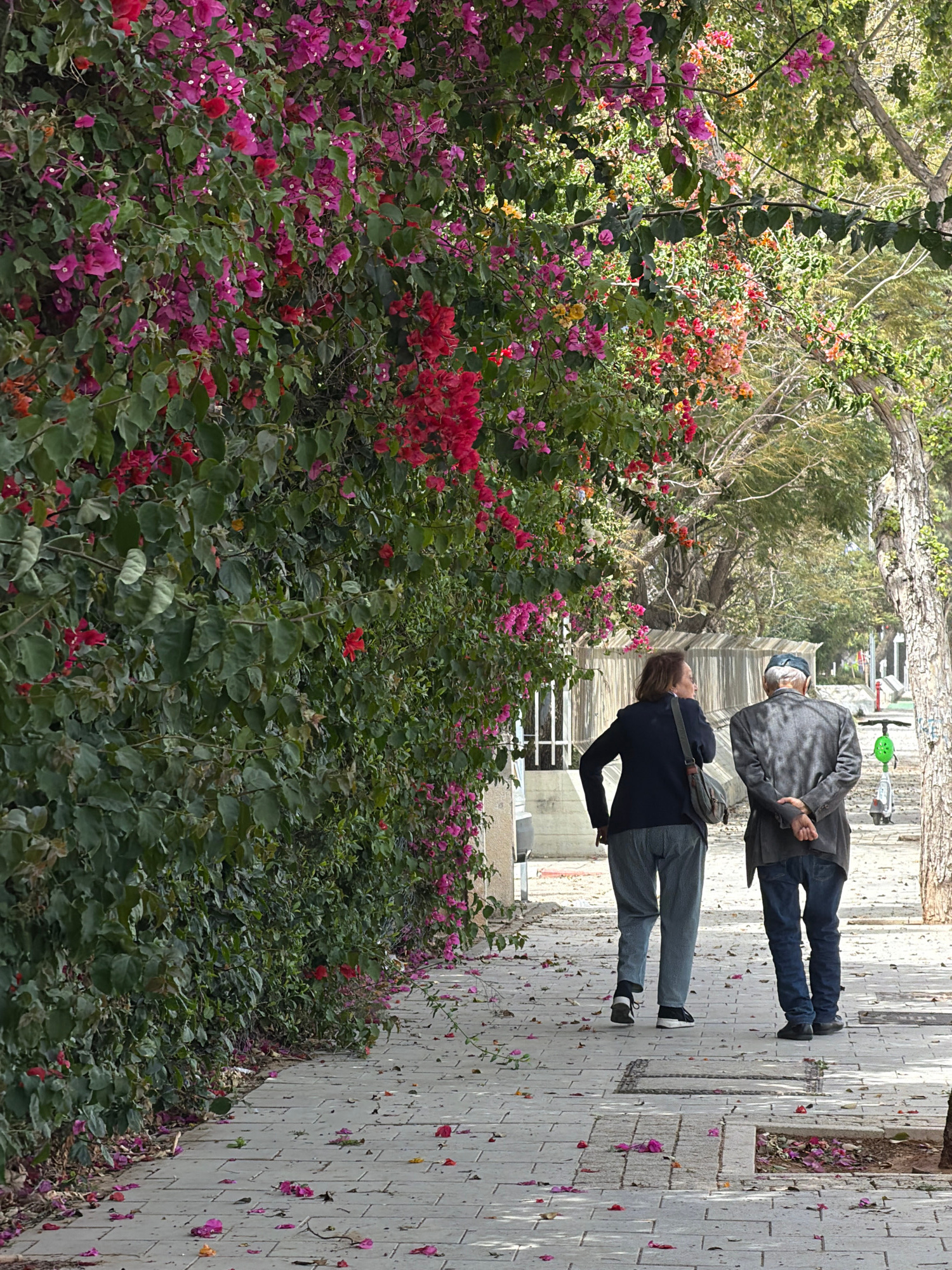 The scene depicts two people walking on a tiled sidewalk in Tel Aviv, Israel. The person closest to the camera is wearing a dark blue top and grey pants. They are walking in the same direction as an o…read more