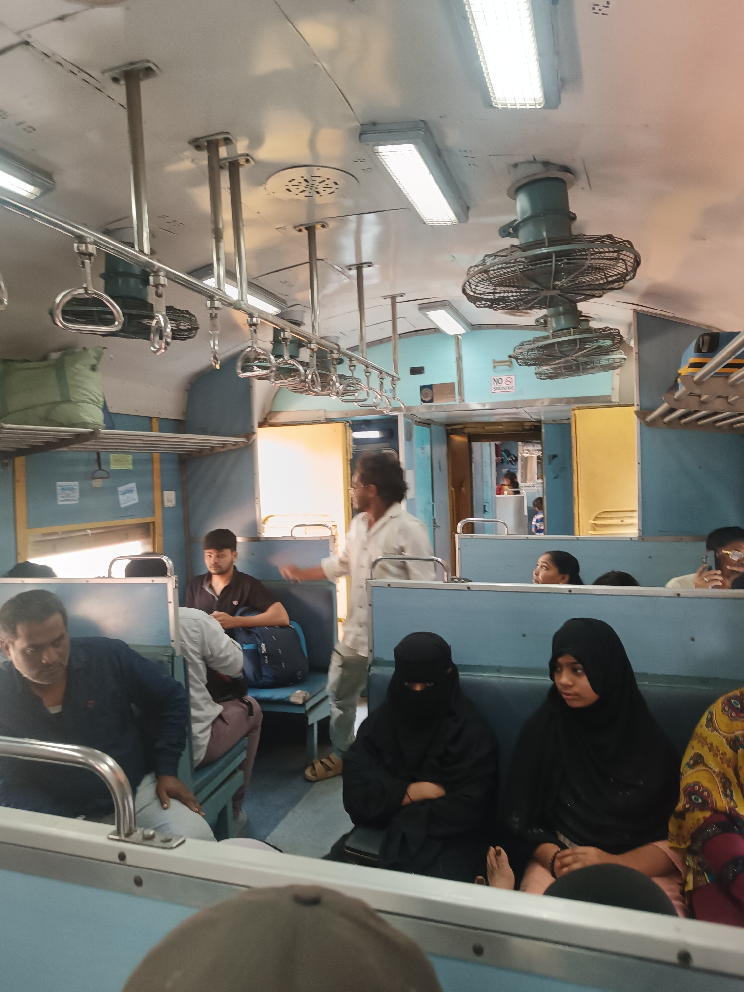 The image depicts the interior of a passenger train carriage in India. Passengers are seated on blue benches. One man stands in the aisle, gesturing. Two women in black burqas are seated near the foreβ¦read more