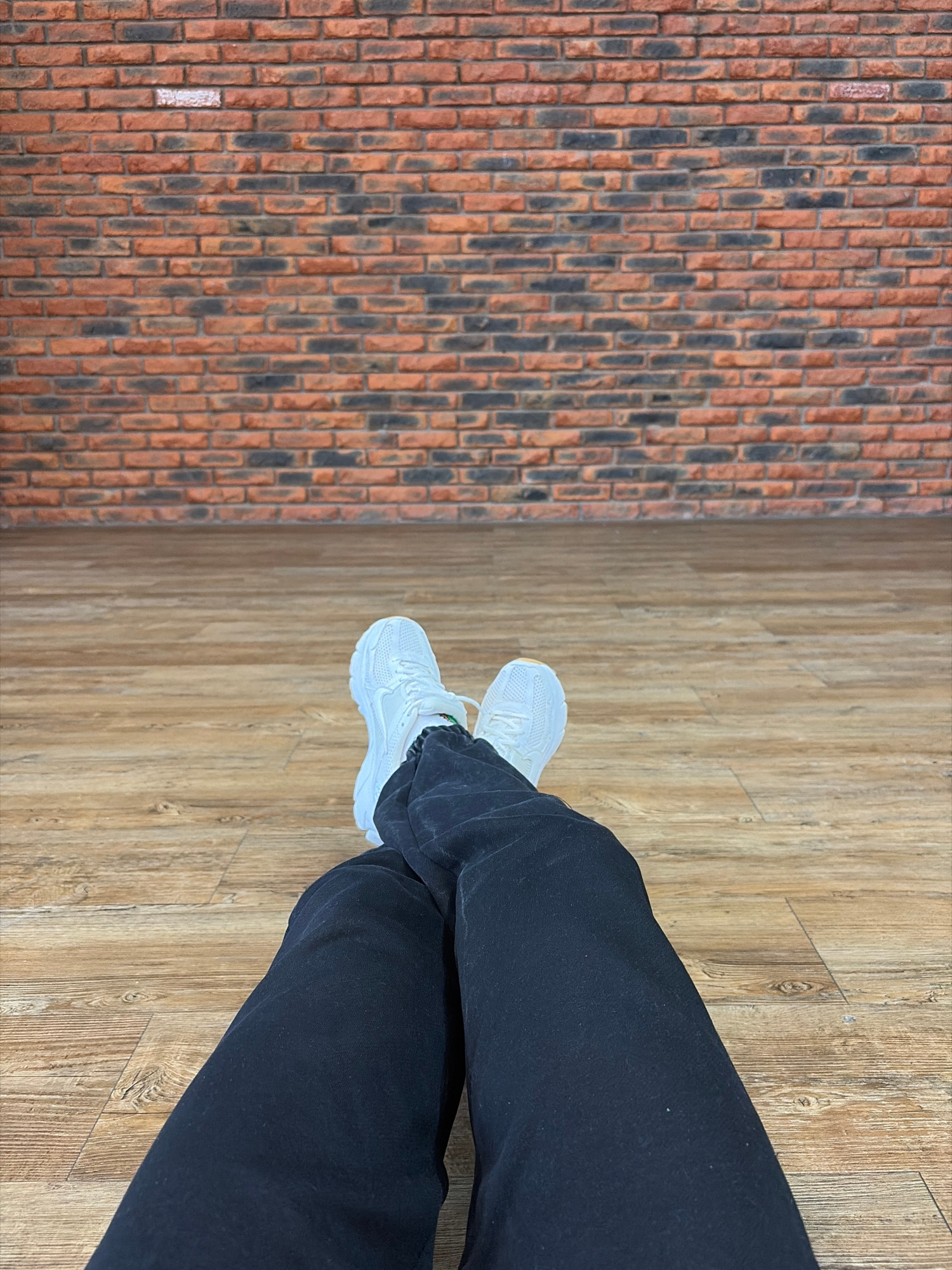 A first-person perspective image shows a person's legs and feet on a light brown wood-grain floor. The person is wearing black pants and white sneakers. To the left of the floor is a brick wall. The l…read more