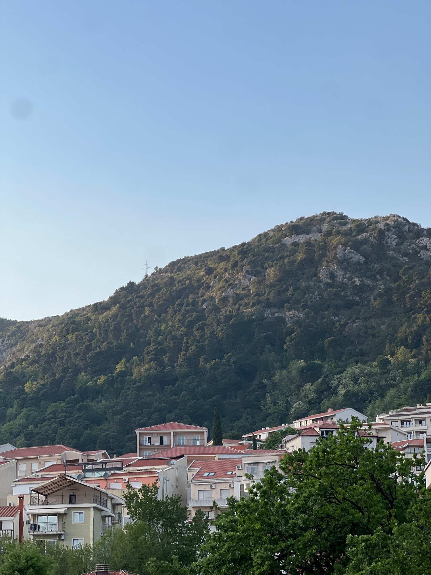 The image shows a view in Budva, Montenegro. A large, rocky, tree-covered mountain dominates the scene. To the right of the mountain is a row of houses and buildings with red-tiled roofs. The sky is aβ¦read more