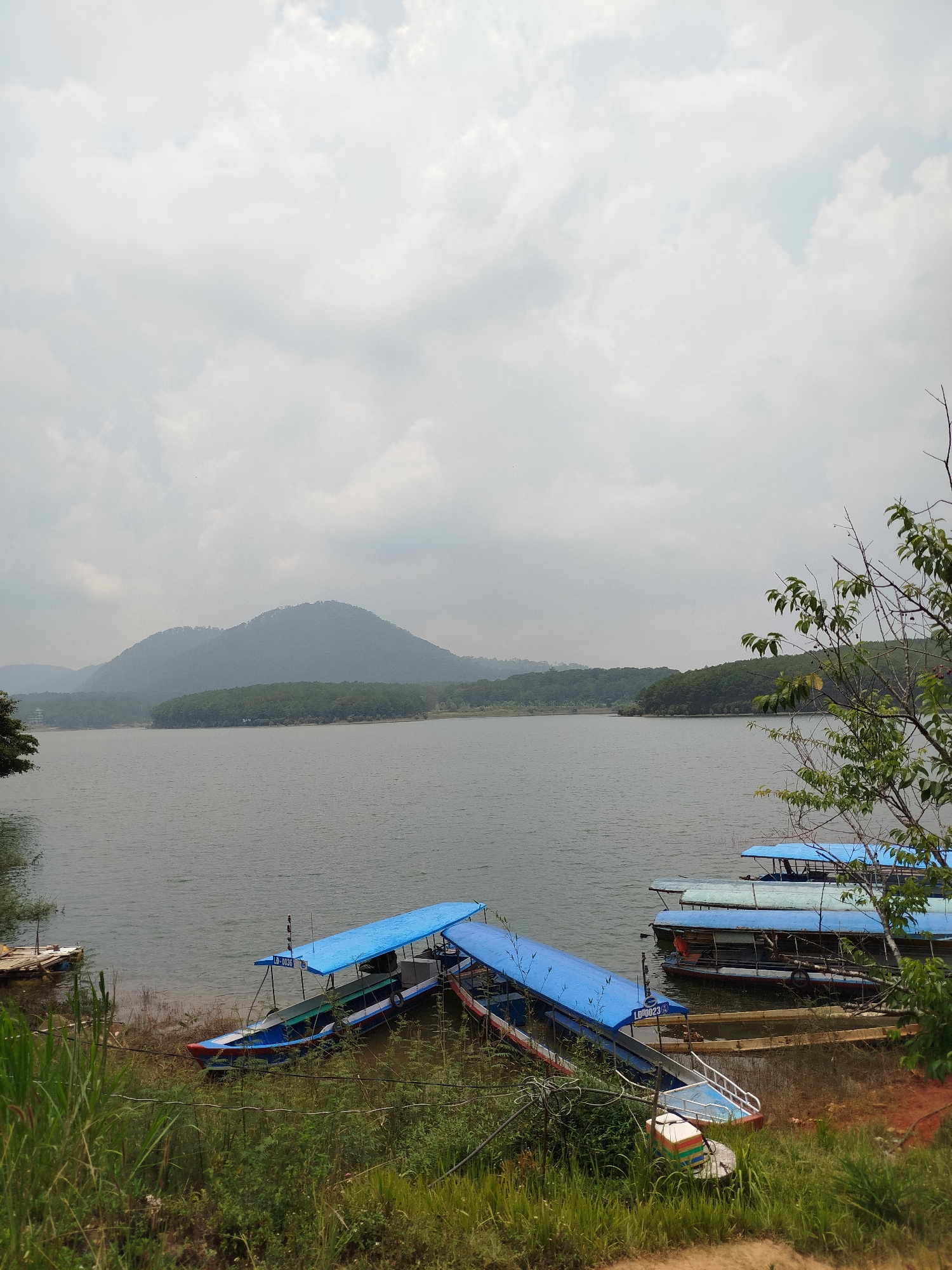The image captures a view of Tuyen Lam Lake in Da Lat, Vietnam on an overcast day. The foreground is dominated by a grassy shoreline with several boats moored. The boats are covered with blue canopies…read more