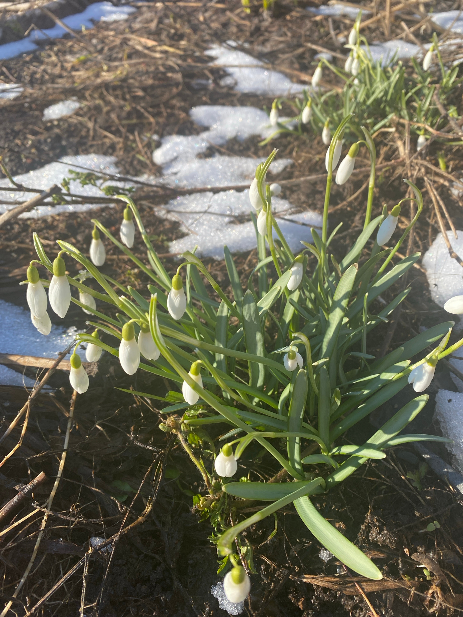 The image depicts a cluster of snowdrop flowers emerging from the ground. Patches of melting snow surround the plants, indicating a transitional season. The background consists of bare earth and some…read more