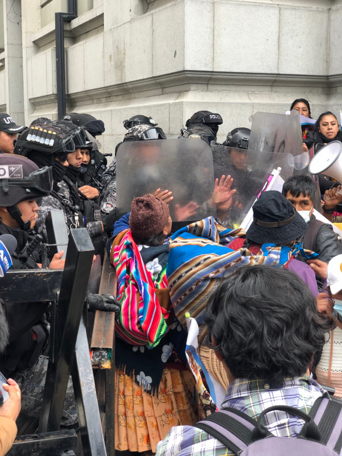 A group of people face a line of riot police behind shields. The crowd includes individuals wearing traditional clothing and carrying a megaphone. Some people have their hands pressed against the shie…read more