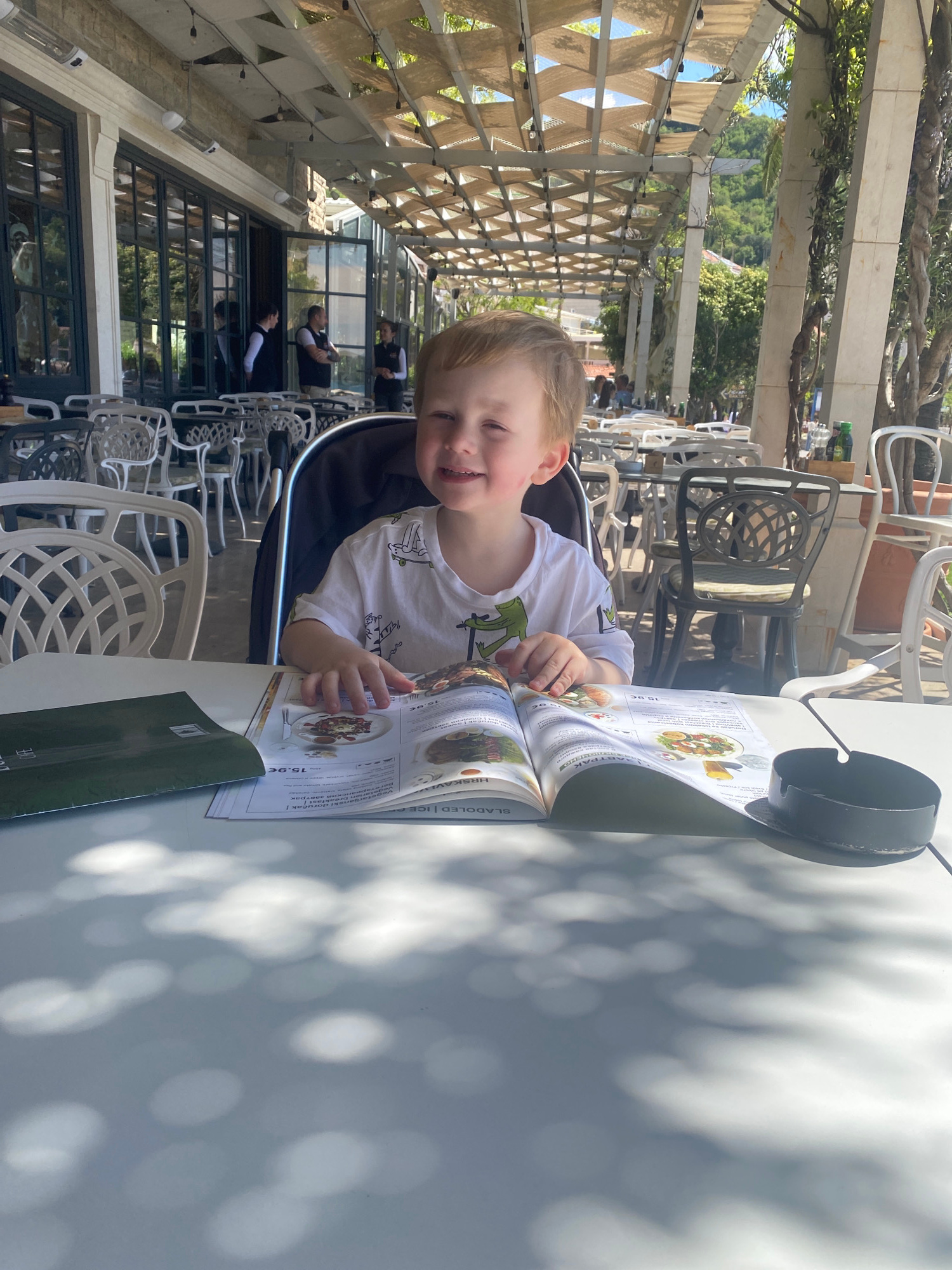 A young boy sits at a table in an outdoor restaurant in Bečići, Montenegro. The restaurant has a lattice-covered awning providing shade. The boy, wearing a white t-shirt with a green dinosaur design,…read more