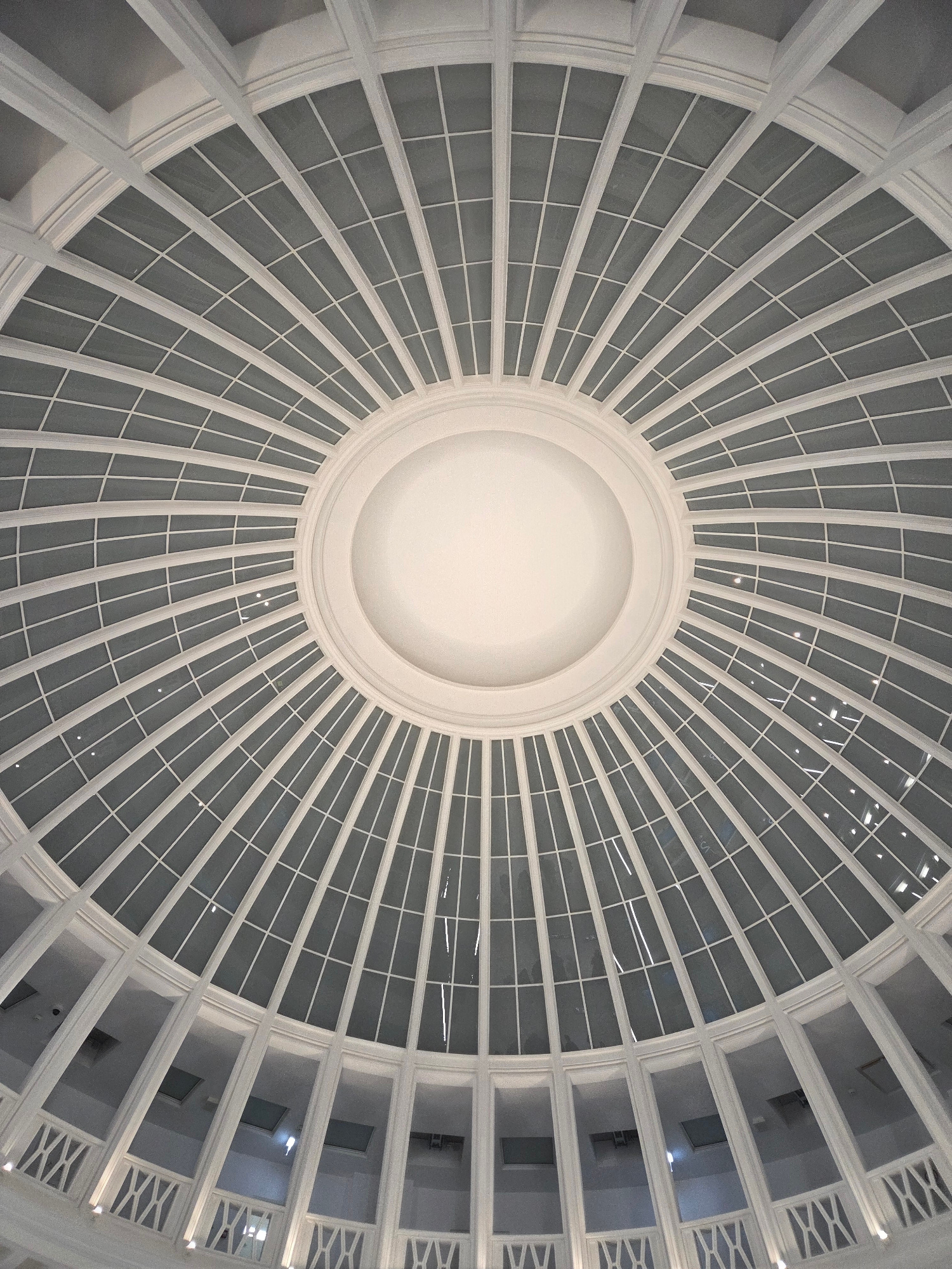 The image shows the interior view of a dome. The dome has a circular design with radiating white beams that create a grid-like pattern with translucent panels in between. A circular feature is located…read more