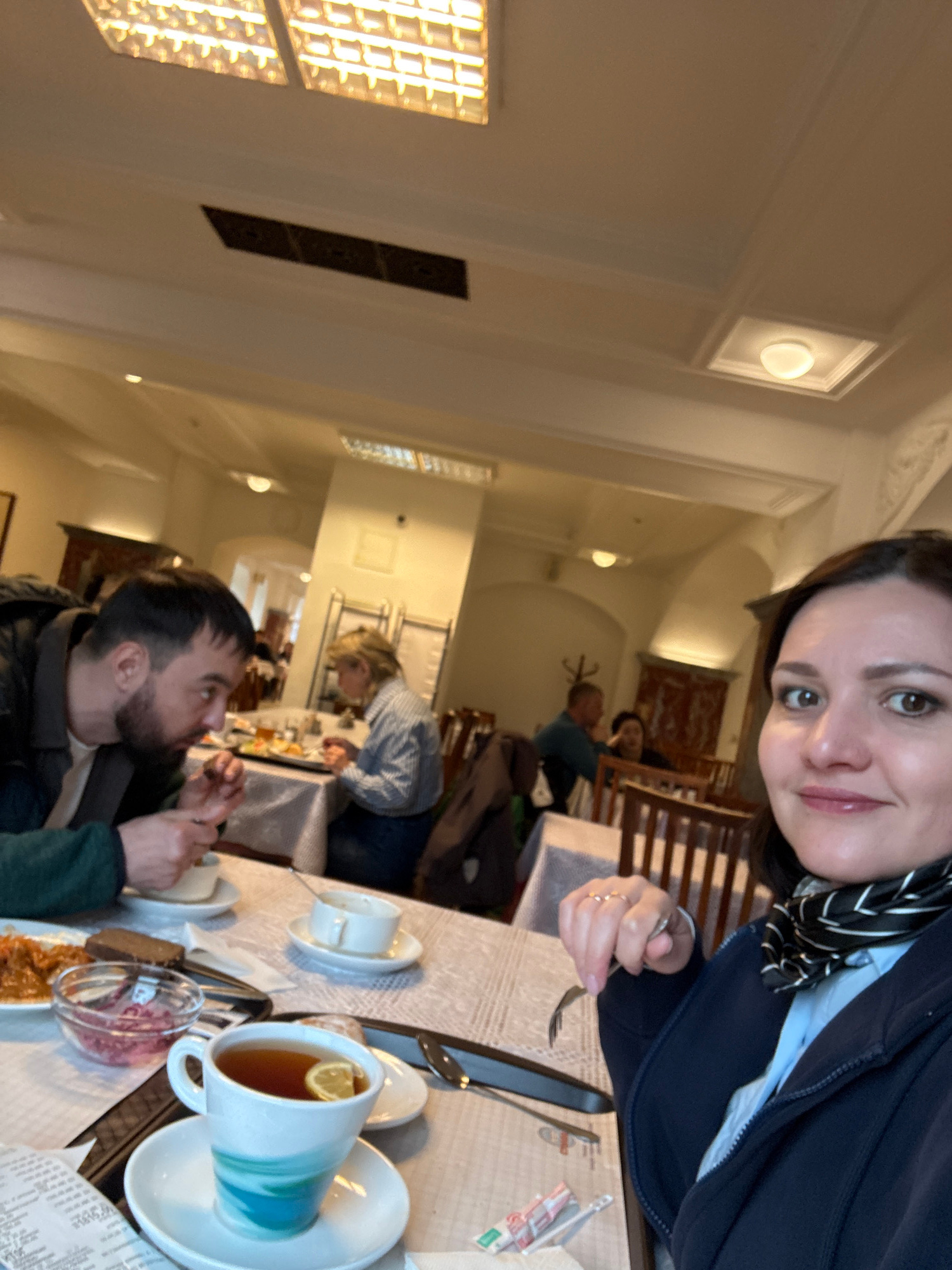 The image is an eye-level photograph showing a woman and a man at a table in a dining room. The woman, who seems to be holding the camera, has brown hair, light skin, and is wearing a dark jacket and…read more