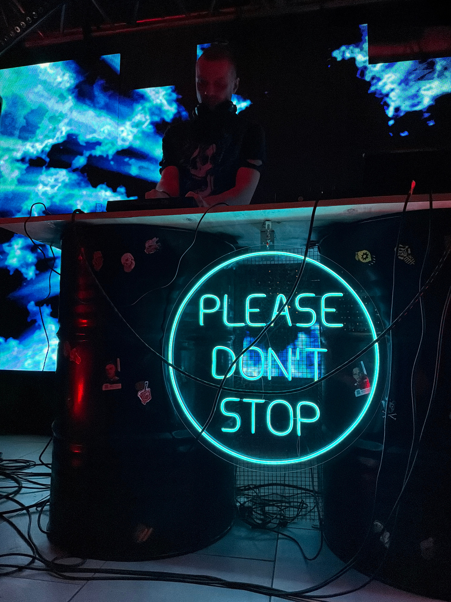 The image shows a DJ booth, likely in a nightclub setting. A person is partially visible behind the equipment, seemingly operating the console. In front of the DJ, a screen displays a blue and white a…read more