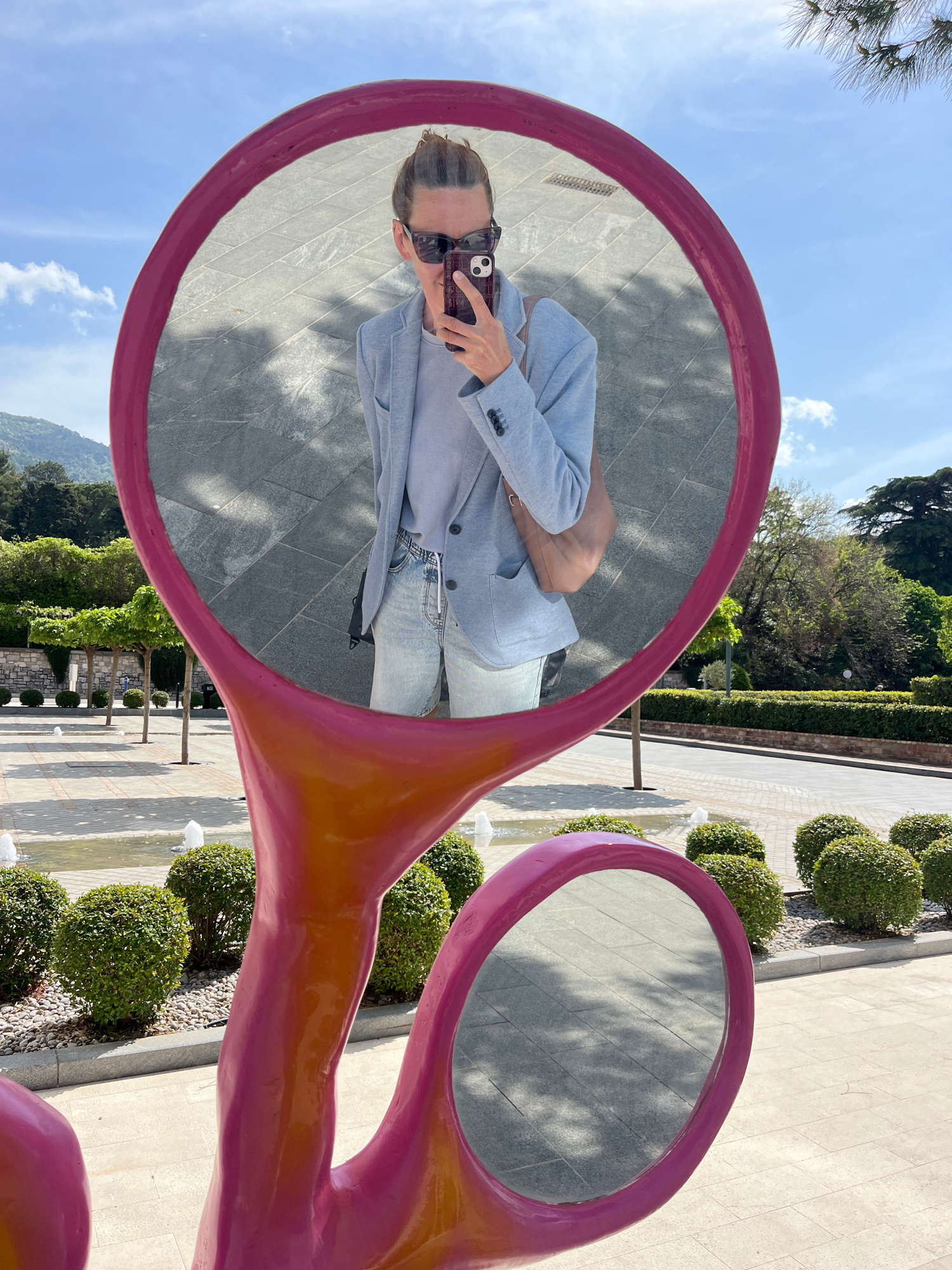 The image depicts a person taking a selfie in a large, pink, decorative sculpture resembling a pair of scissors. The scissors appear to function as mirrors, reflecting the person and the surrounding e…read more