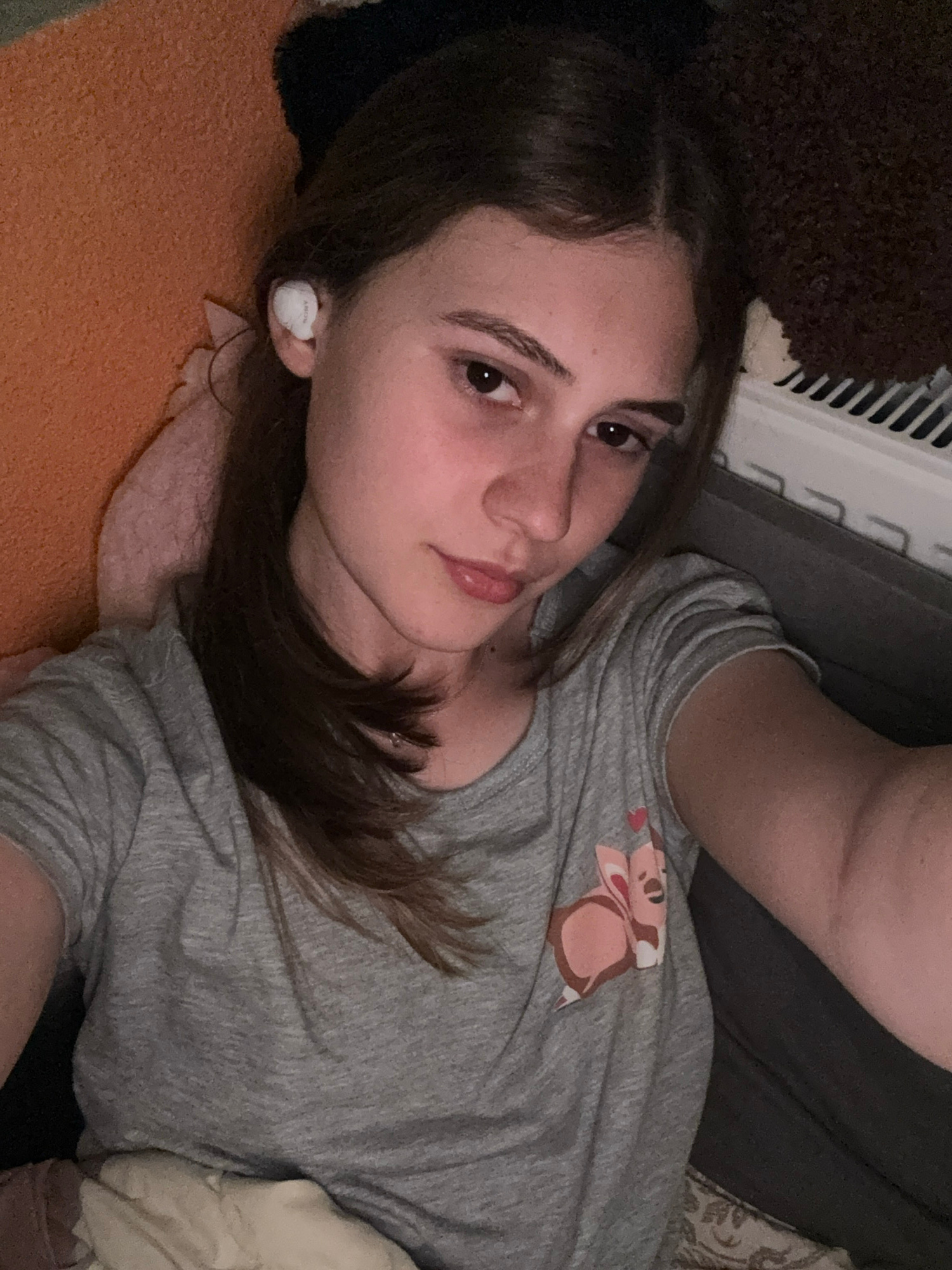 A young person, likely female, is pictured indoors, lying on their left side and looking directly at the camera with a calm, relaxed expression. They have long, dark hair parted on the side and dark eβ¦read more