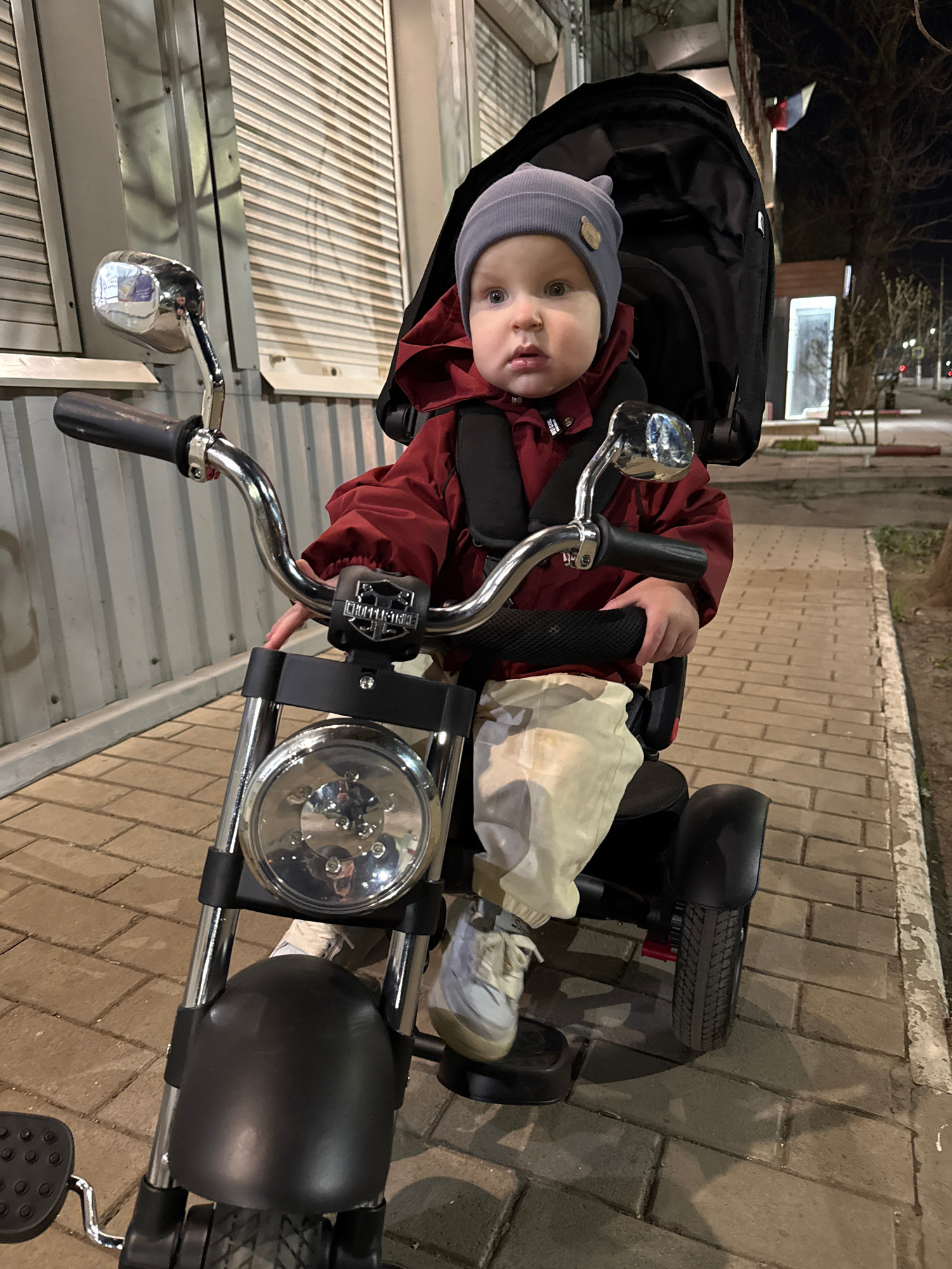 A baby with a grey beanie, red jacket, and white shoes sits in a tricycle. The tricycle has a black canopy, chrome handlebars, and a large headlight. The location appears to be a city street in Donets…read more