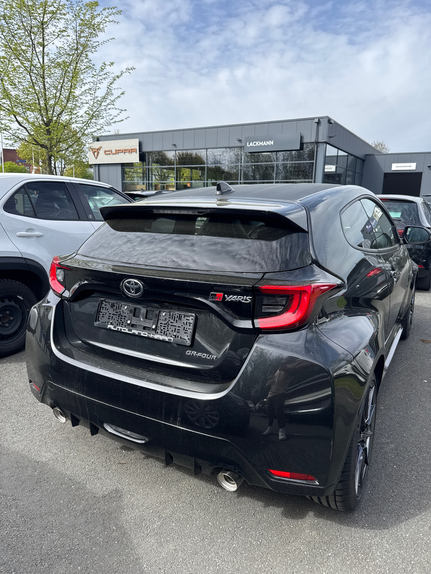 The image shows the rear of a black Toyota GR Yaris parked at a car dealership. The car has a license plate obscured for privacy, and "GR-FOUR" is visible on the lower right side of the car's trunk. T…read more