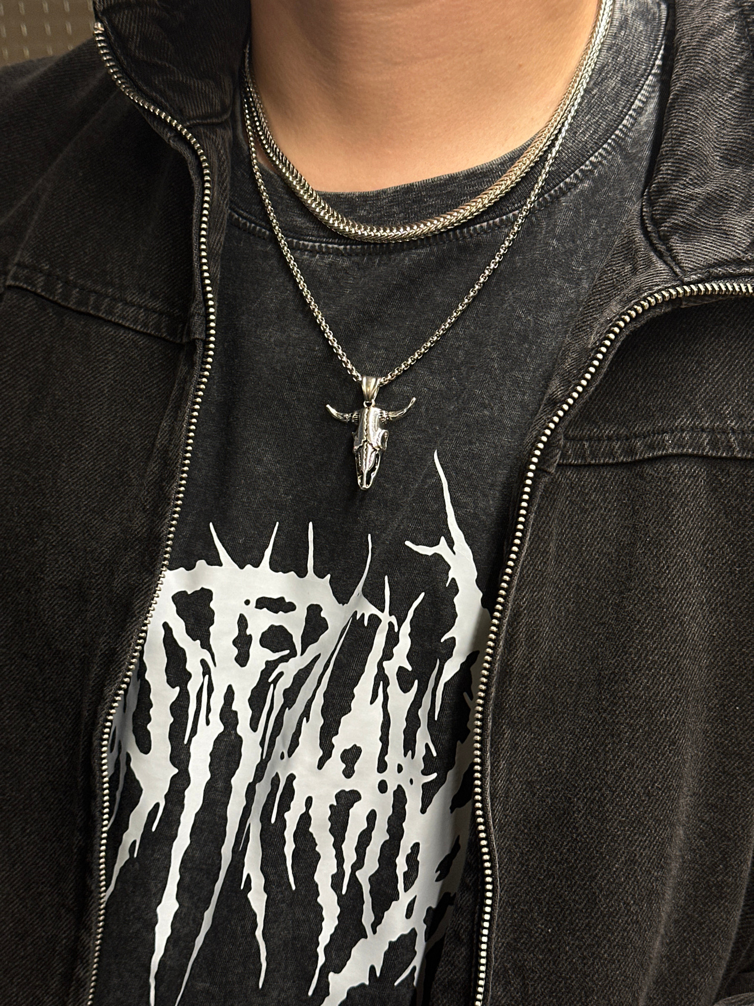 The image depicts a close-up view of a person's upper torso, adorned with clothing and jewelry. The individual is wearing a dark, possibly denim jacket, which is partially zipped up. Beneath the jacke…read more