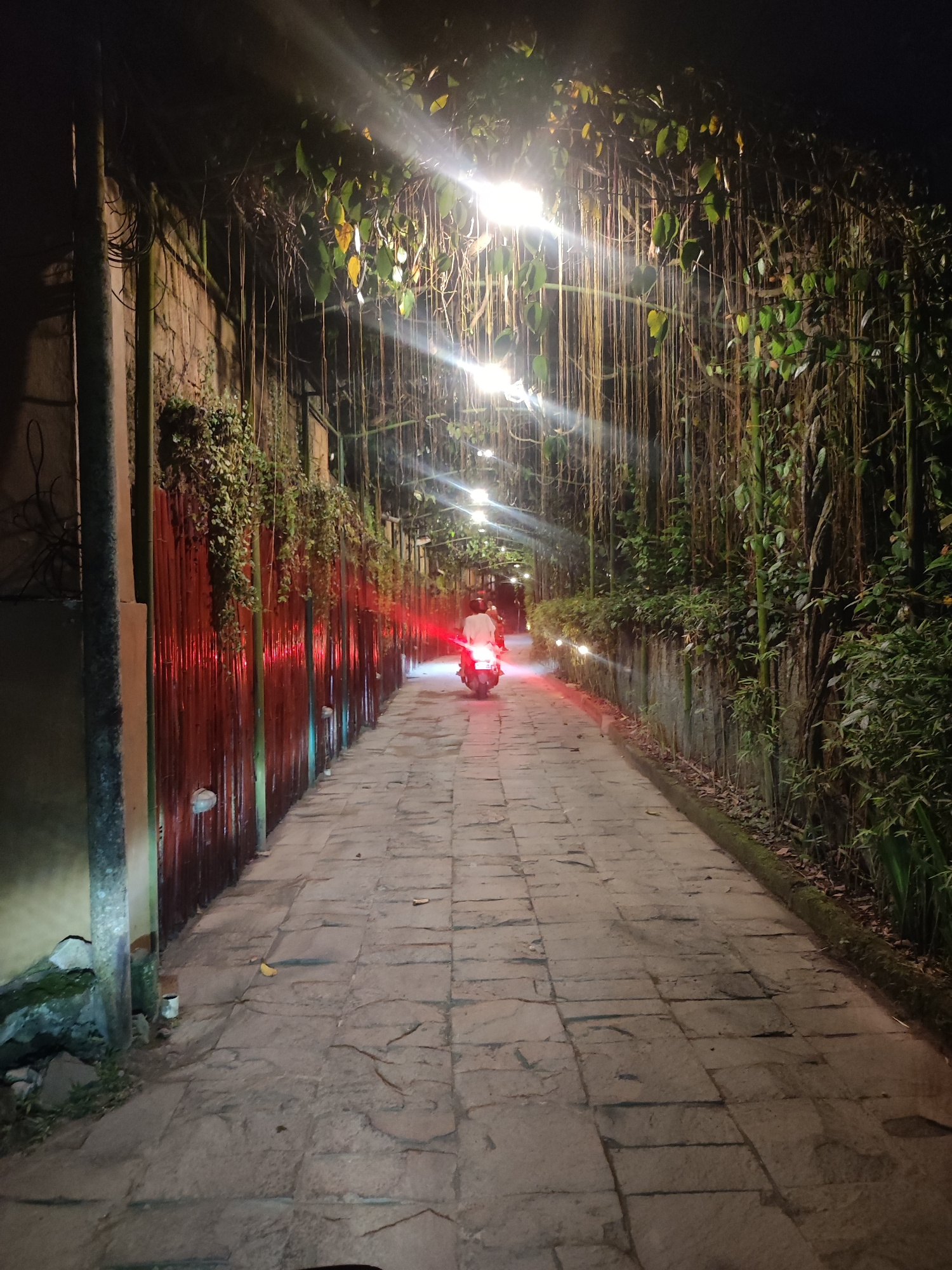 This nocturnal image presents a narrow, stone-paved pathway lined with dense, overhanging vegetation, creating an enchanting, tunnel-like passage. A solitary individual is seen riding a white scooter…read more