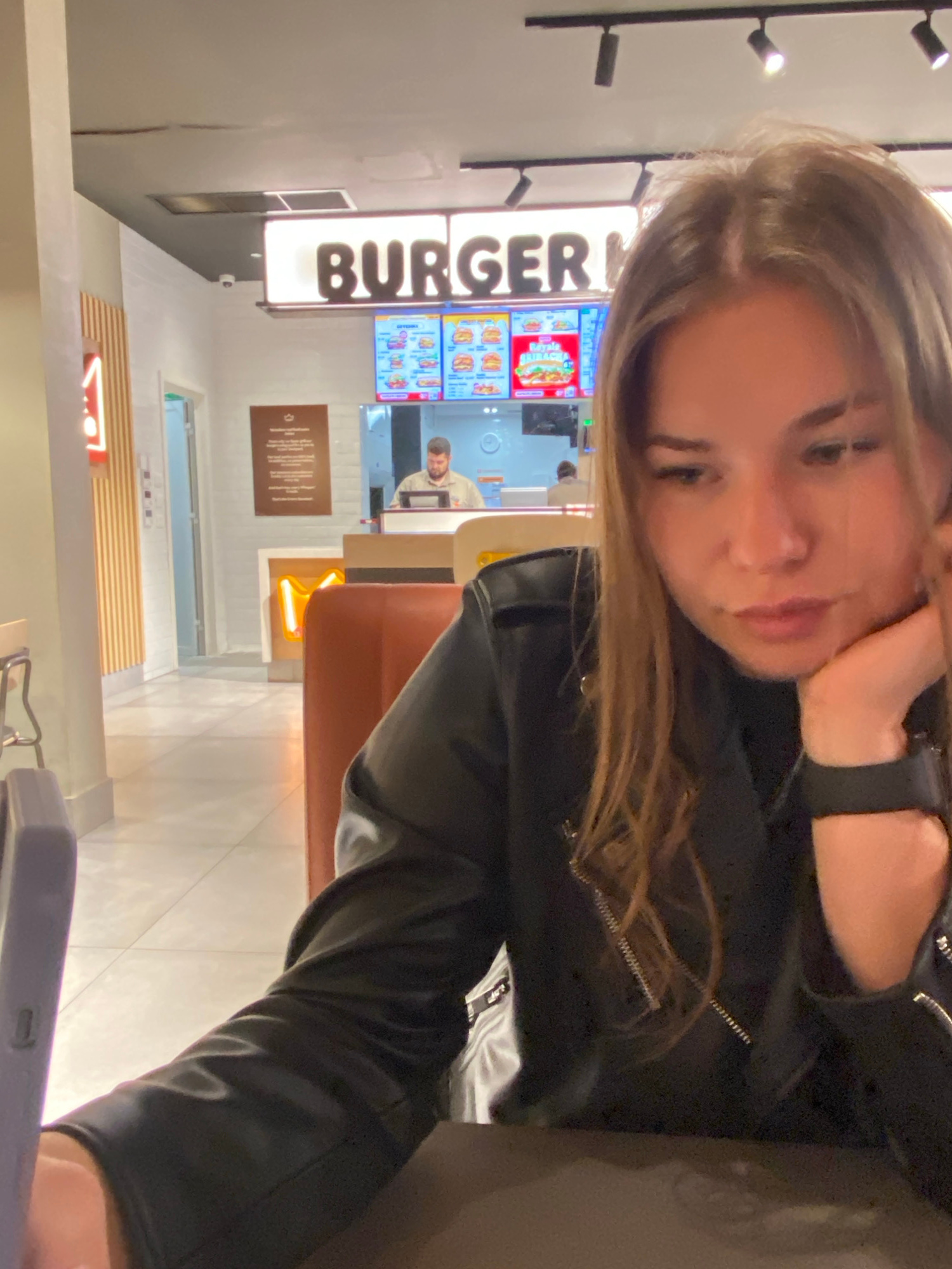 A young woman with light brown hair sits in a fast-food restaurant. She wears a black leather jacket. In the background, a Burger King menu board is visible. A restaurant employee stands behind the co…read more