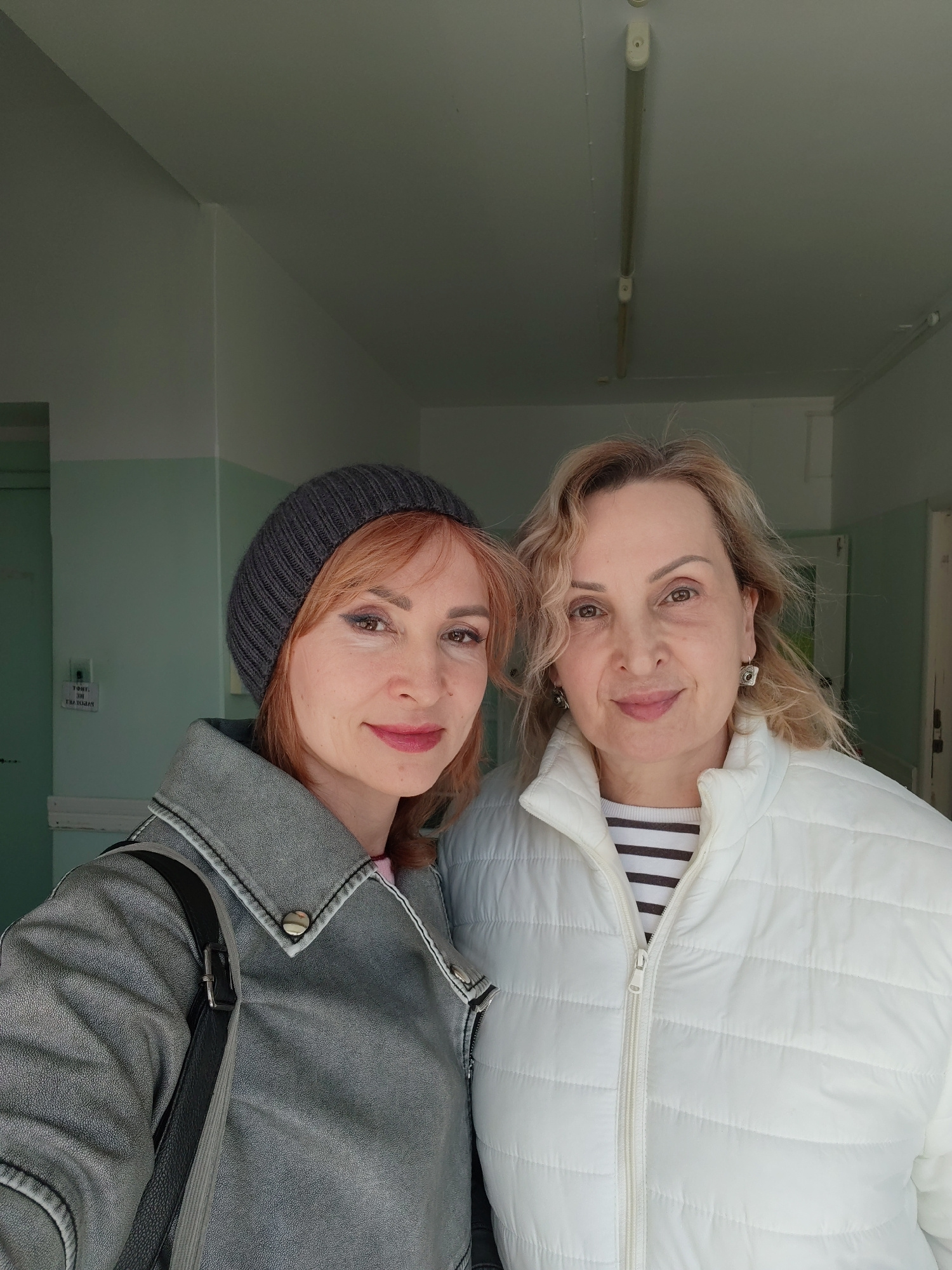 The image captures two women posing for a photo in an indoor hallway, likely in Chaikovsky, Russia. The woman on the left has reddish-brown hair and is wearing a dark grey knitted beanie and a grey fa…read more