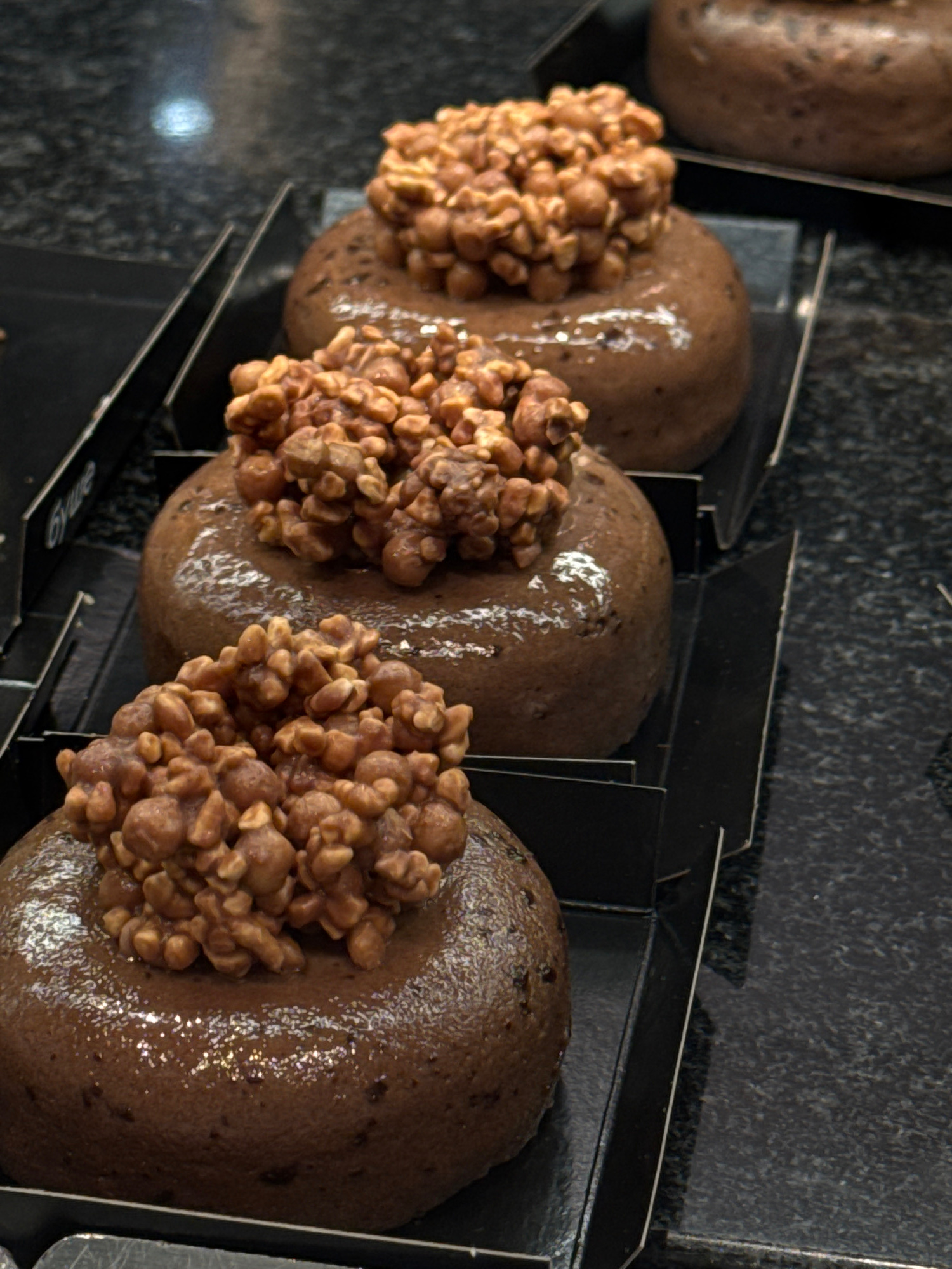 The image shows a close-up of three donuts in individual black boxes. The donuts are round, covered in a smooth, dark brown glaze, and topped with a cluster of light brown, nut-like pieces. They are a…read more