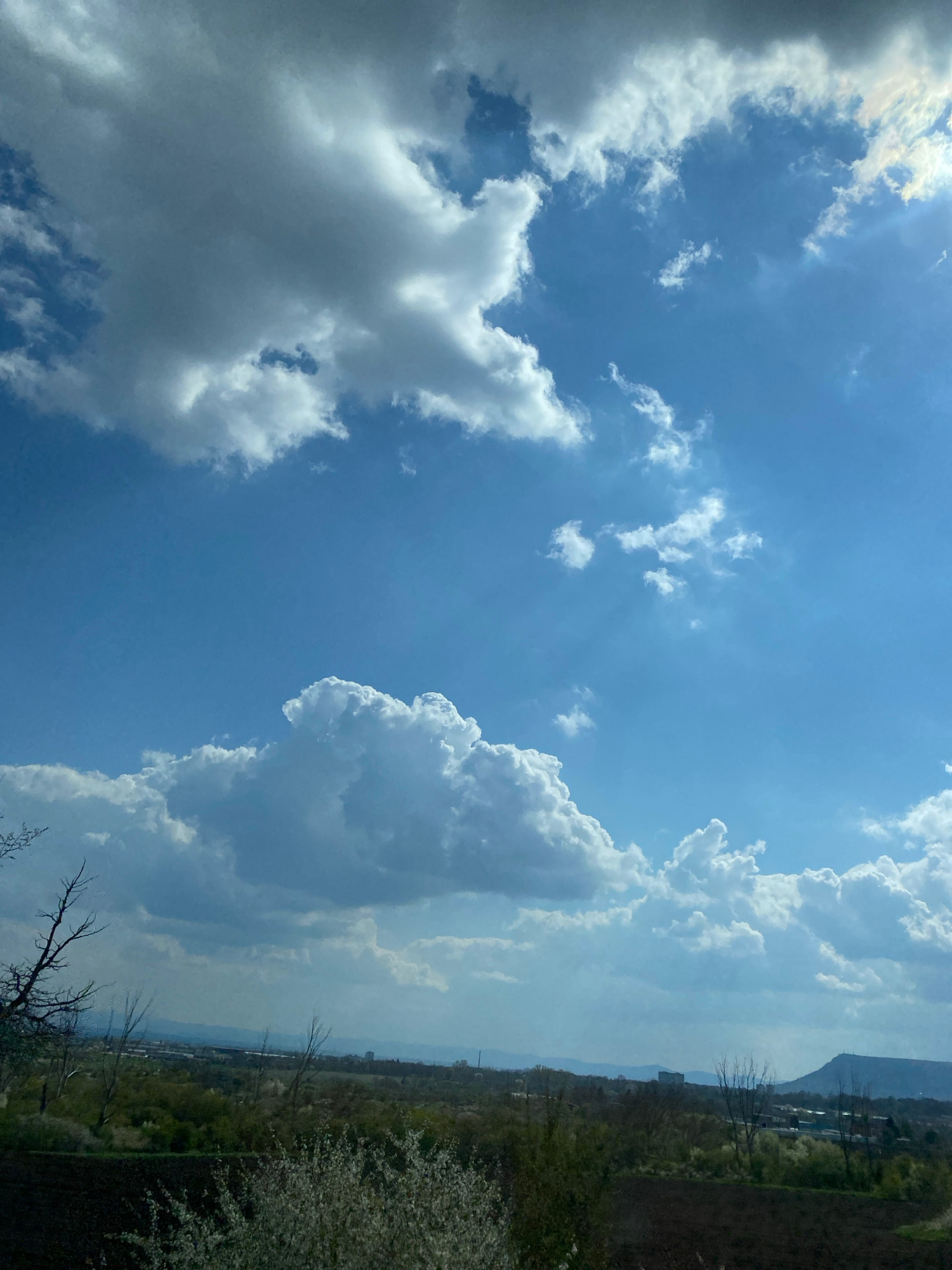 The image shows a view of the sky with a large cloud formation on the right side and scattered clouds on the left. The sky is blue, with some areas appearing lighter due to the sunlight. On the right,…read more