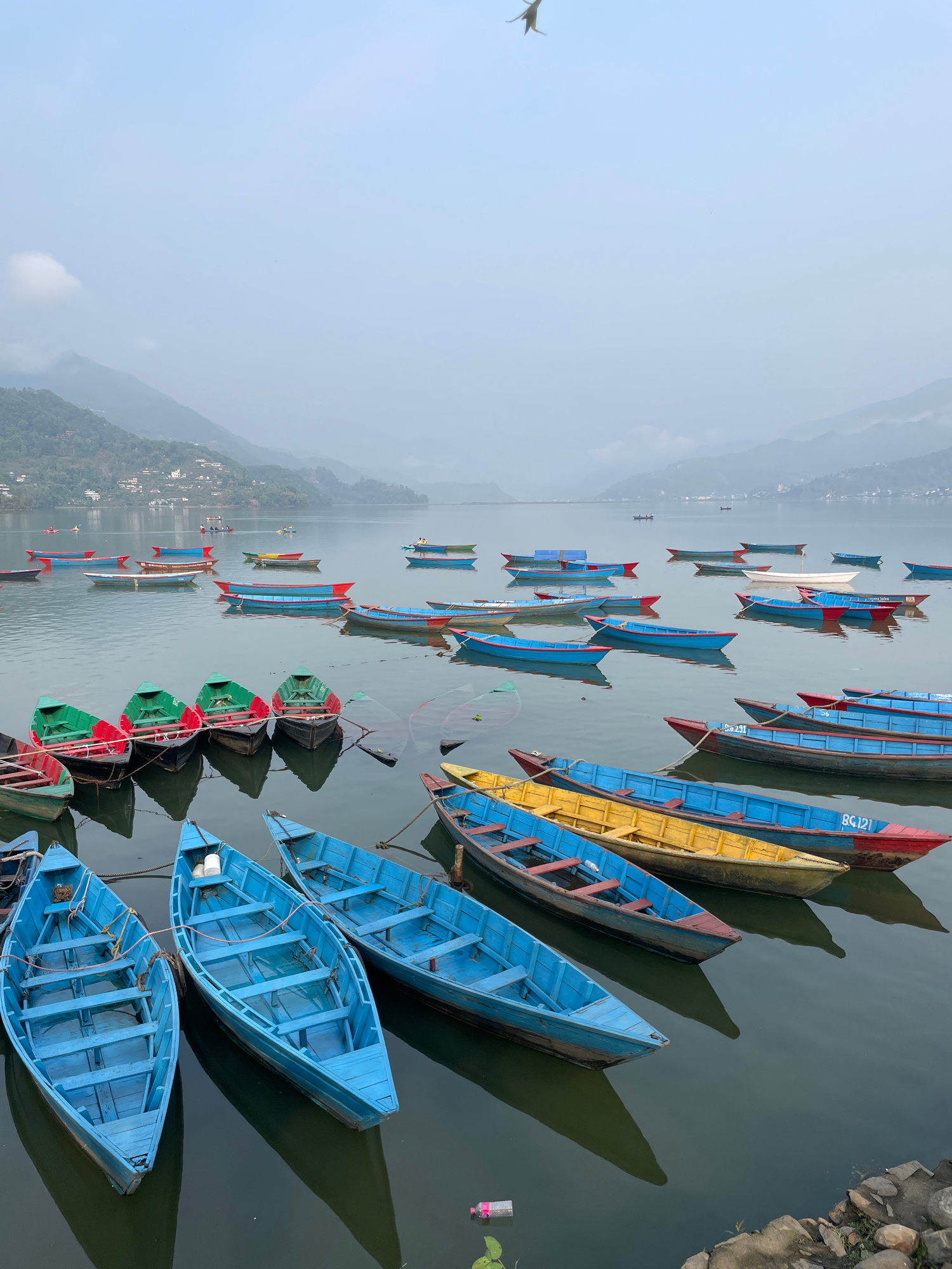 The image depicts a wide view of Phewa Lake in Pokhara, Nepal, under a hazy, overcast sky. Approximately 50 to 60 brightly colored wooden rowboats, primarily blue, red, green, and yellow, are distribu…read more