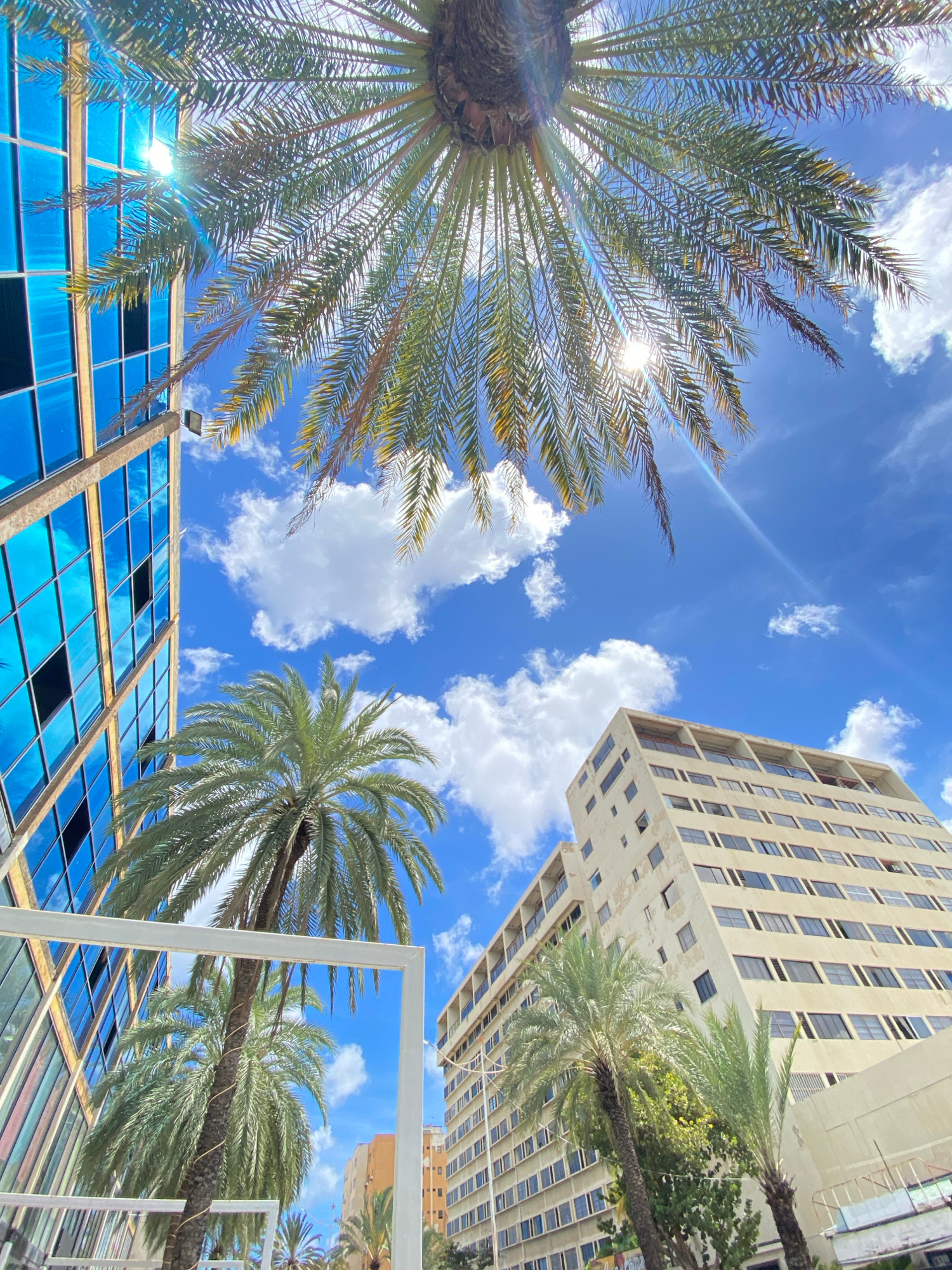 The image presents a low-angle view looking up at a partially cloudy blue sky, juxtaposed with elements of urban architecture and nature. At the bottom left, a palm tree's fronds extend across the fra…read more