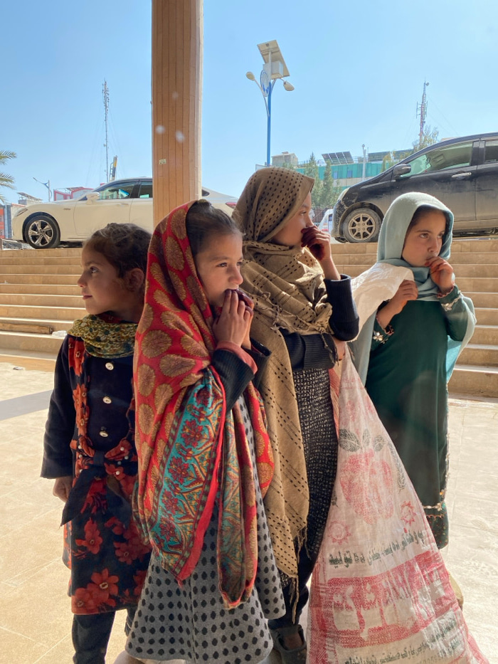 The image depicts four young females standing outdoors in the city of Kandahar, Afghanistan, under bright daylight with a clear blue sky. They are positioned in a line, facing generally towards the ri…read more
