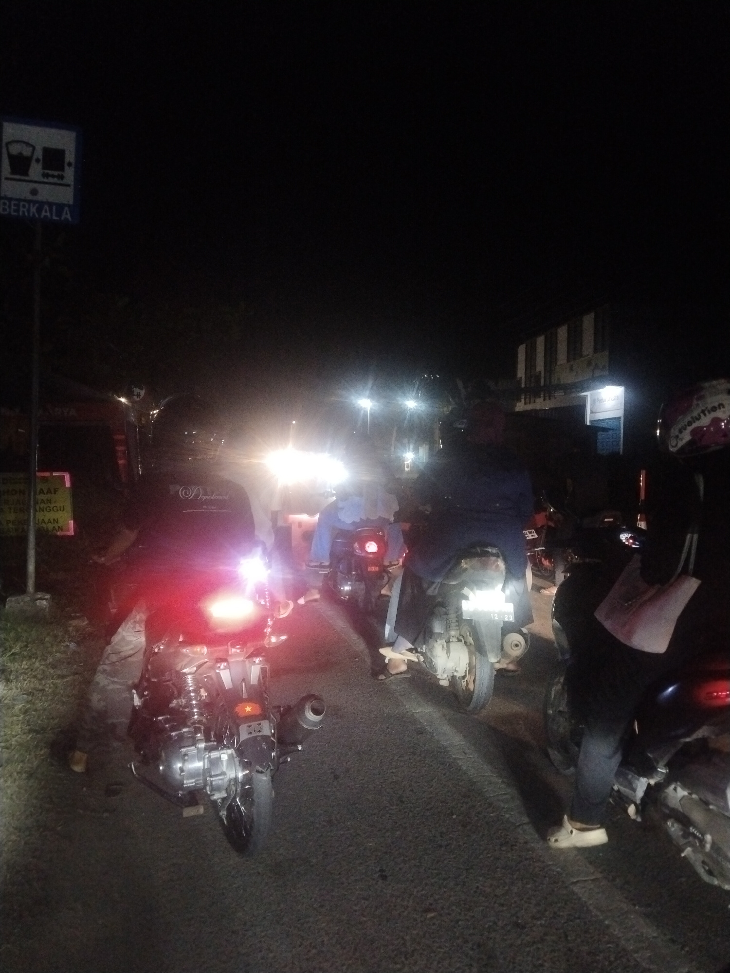 The image shows a congested street scene at night in Lhokseumawe, Indonesia. Several motorcycles are lined up on the road, facing forward. People are seated on some of the motorcycles, likely waiting…read more