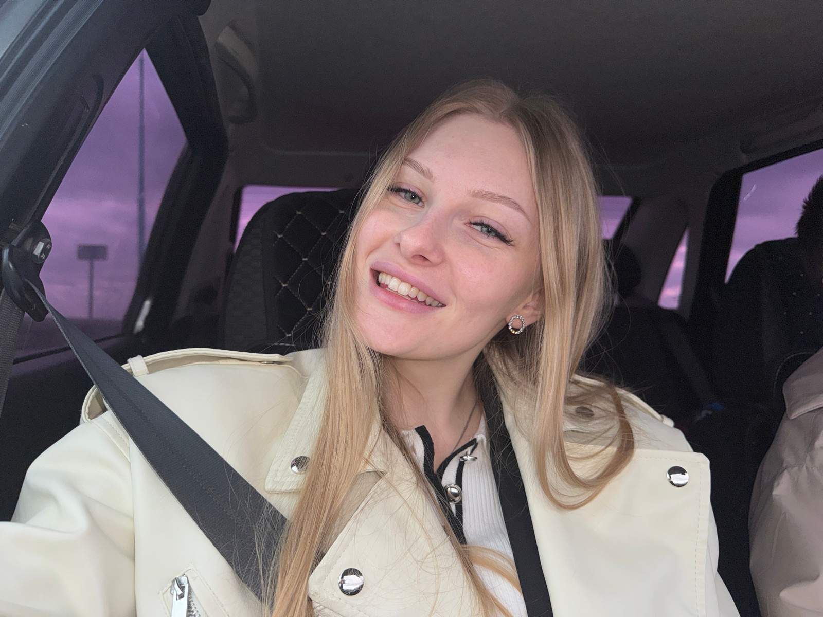 A selfie taken in a car shows a young woman with fair skin and blonde hair. She is wearing a white leather jacket and a seatbelt. The car's interior includes black leather seats with a quilted pattern…read more