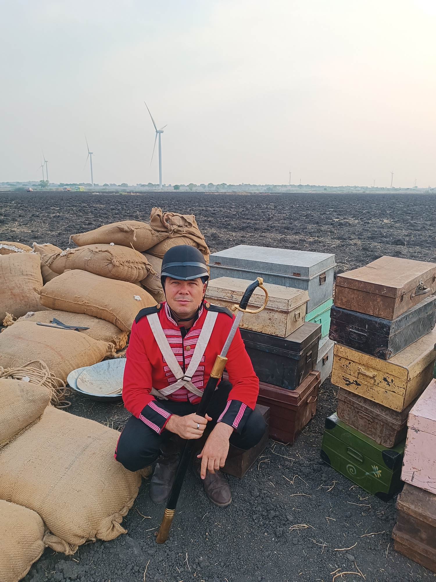 A male individual, approximately 30-40 years old, is depicted in a crouching position on dark, loose ground in an open field in Kottalapalli, India. He wears a red military-style jacket with black cuf…read more