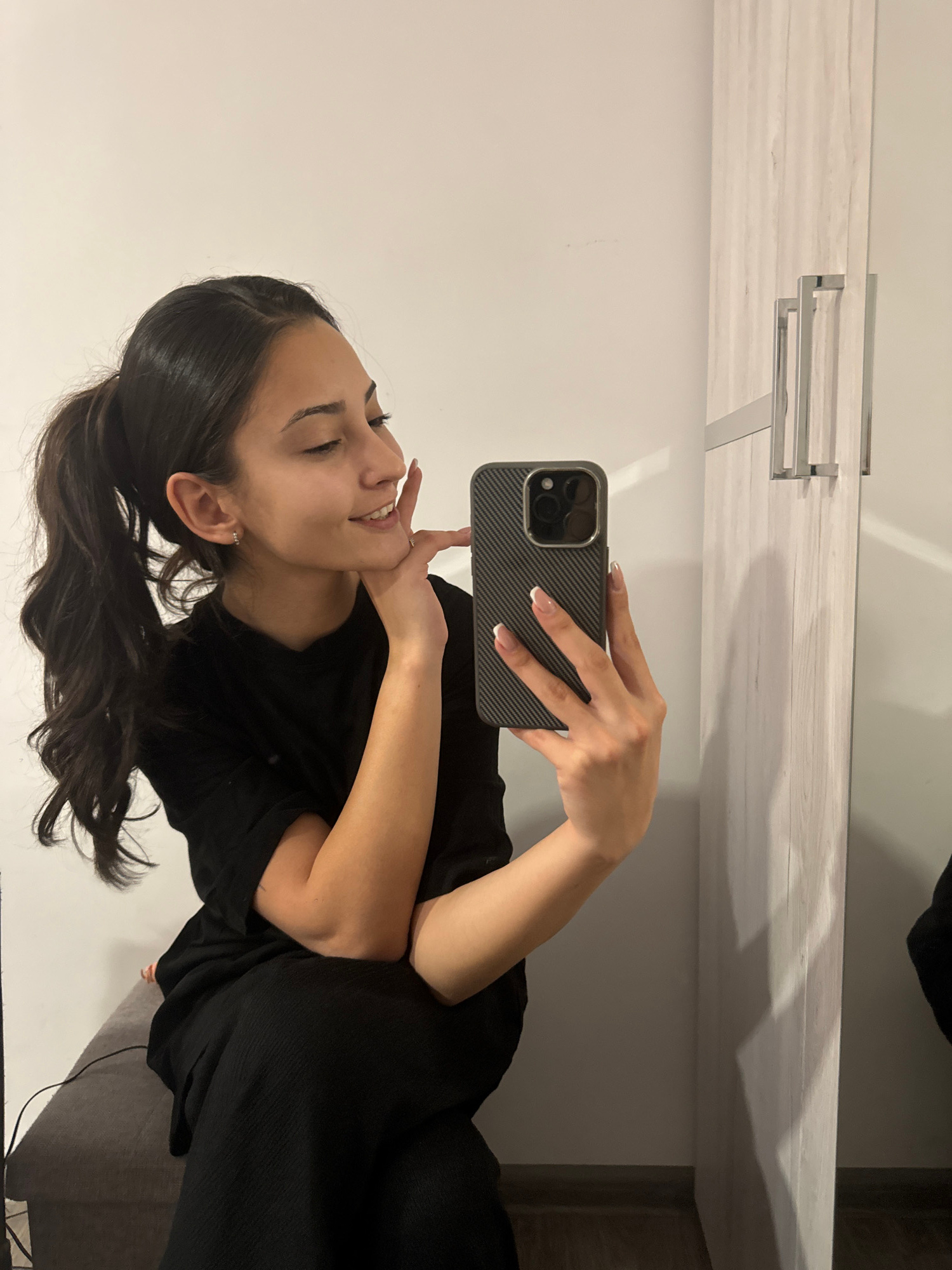 A young woman with dark hair pulled back in a low ponytail is taking a selfie in a room. She is wearing a black top and holding a dark-colored smartphone with a carbon fiber-textured case. Her fingern…read more