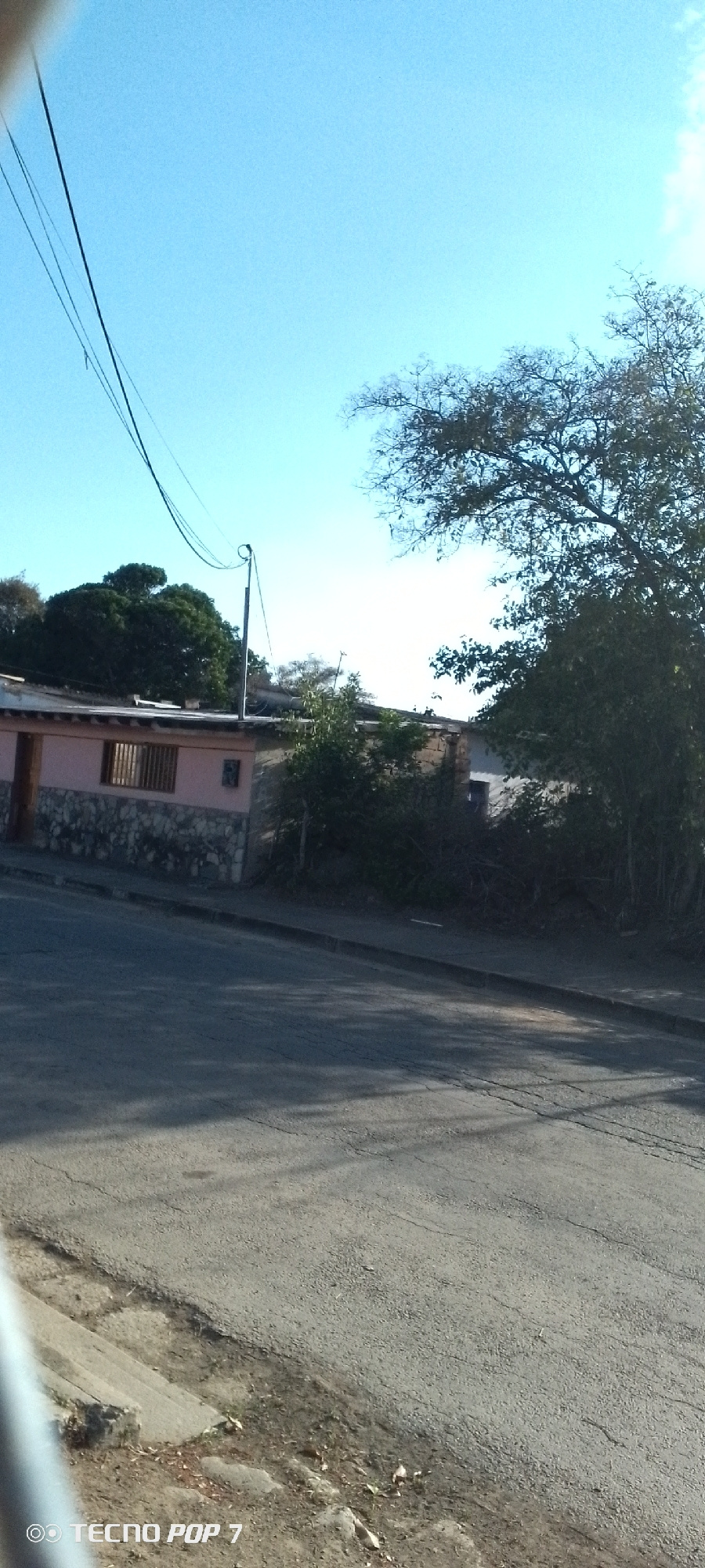 The image shows a street scene in Altagracia, Venezuela. A paved road occupies the foreground and middle ground, casting shadows. A single-story building is situated on the left, featuring a pink faca…read more