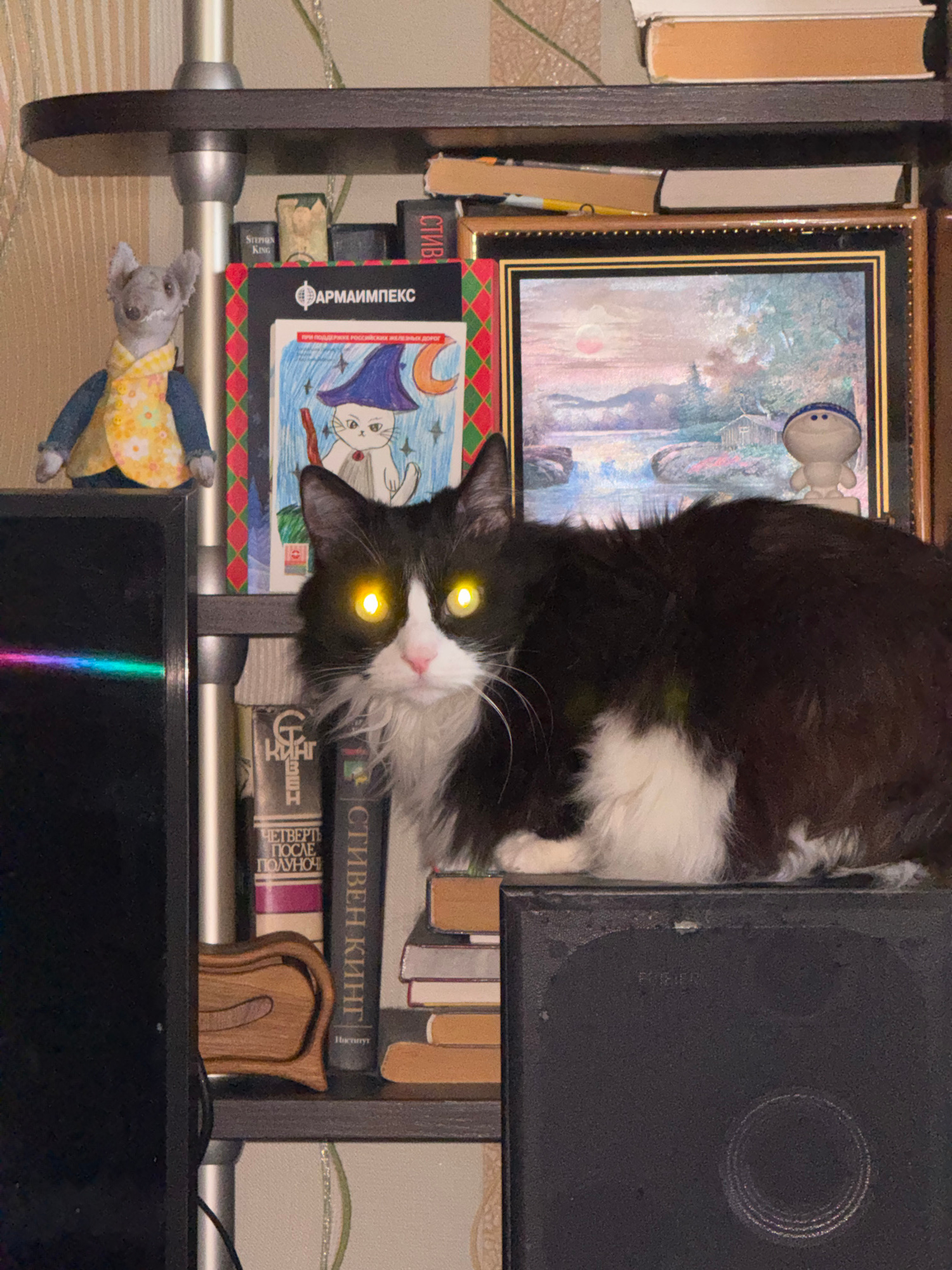 A black and white cat with medium-long fur is captured in a close-up, hanging upside down from a wooden shelf. Its head, with glowing yellow eyes, and front paws are visible as it looks directly towar…read more