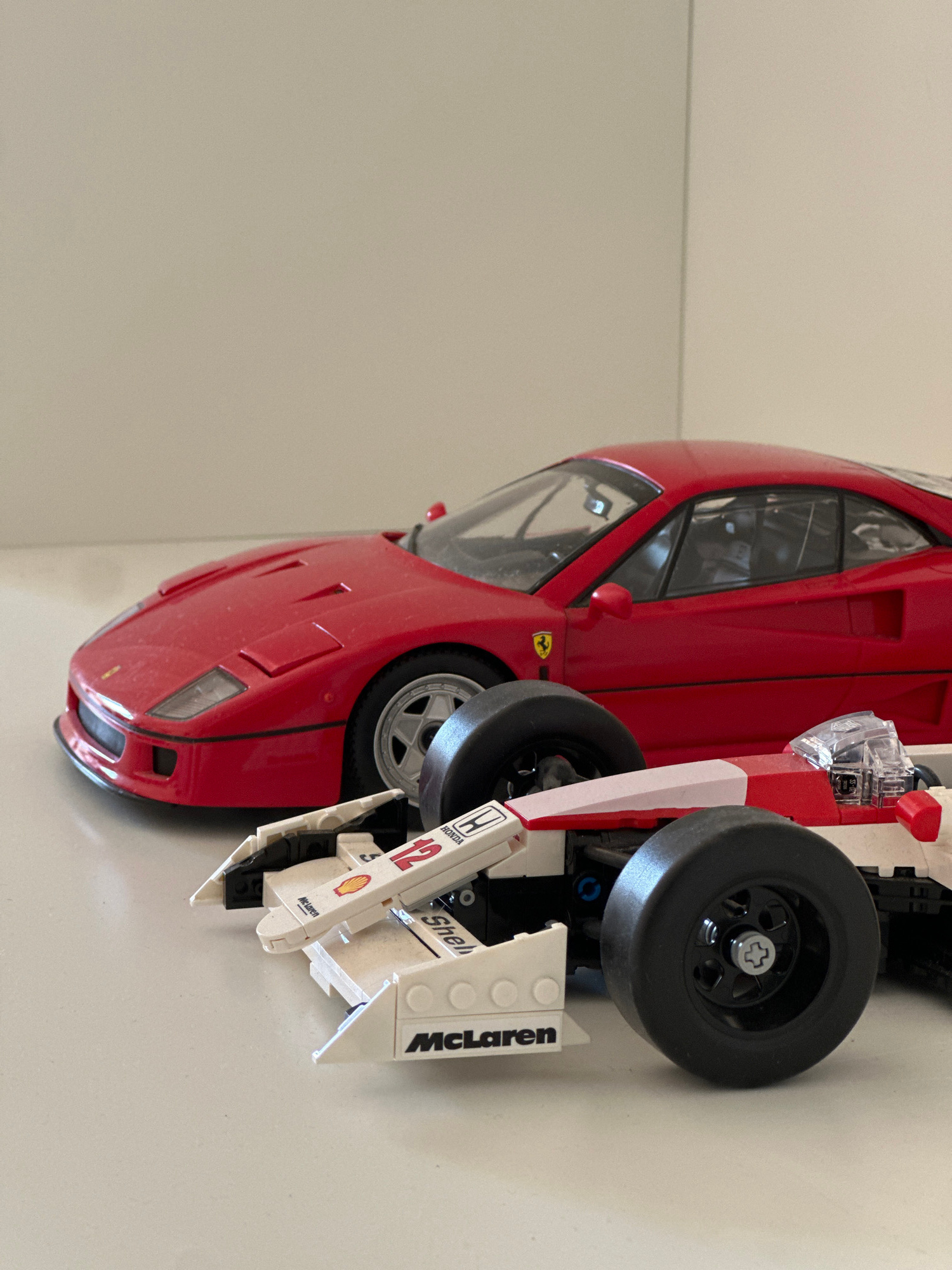 The image captures two detailed model cars, rotated 90 degrees counter-clockwise, against a plain, light-colored background. The setting appears to be indoors, possibly on a shelf or table. On the le…read more