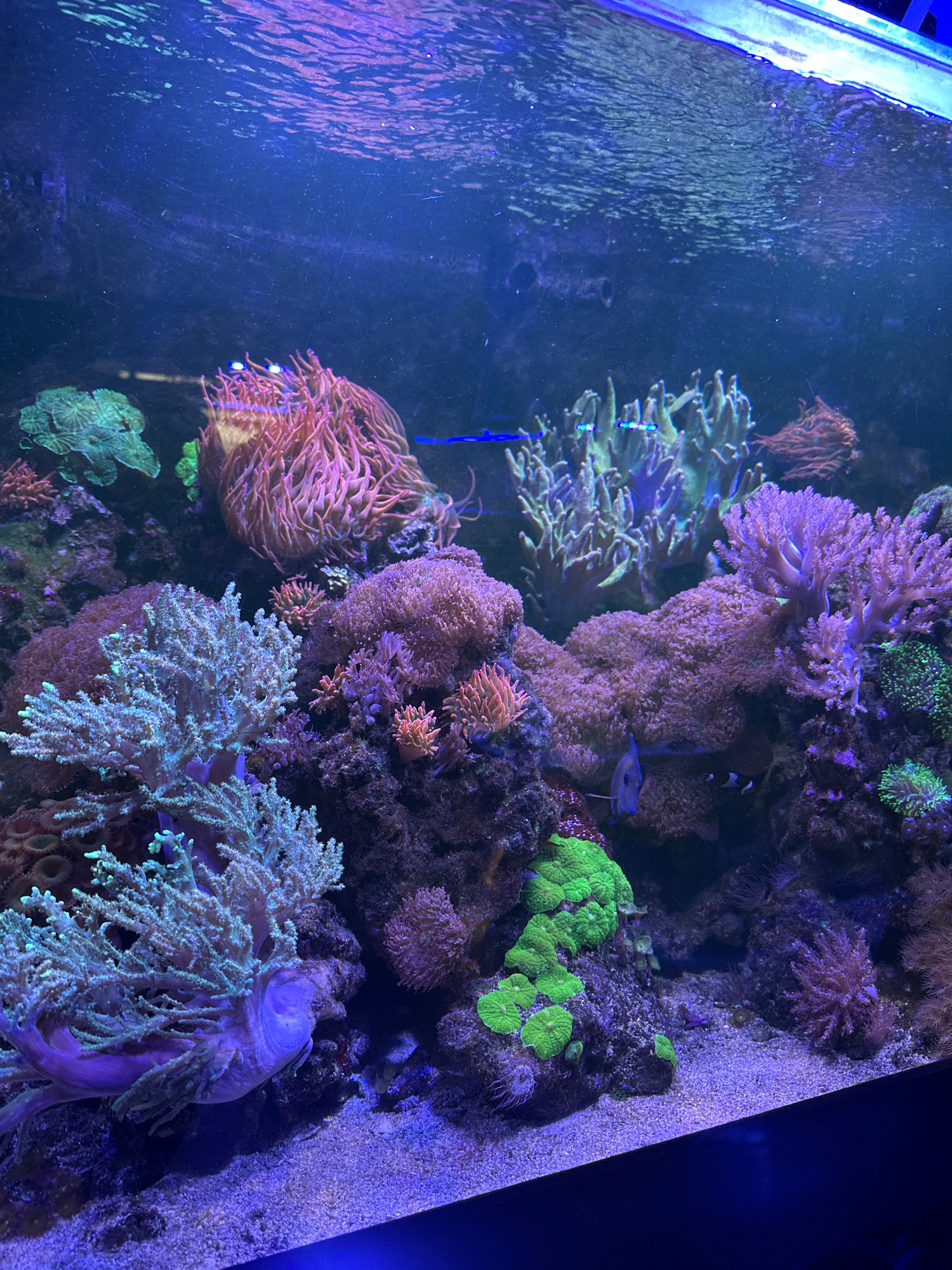 The image shows a saltwater aquarium. Inside the aquarium, there are various types of coral in shades of purple, green, and brown. Two fish are visible. The tank's water is slightly murky. The image w…read more