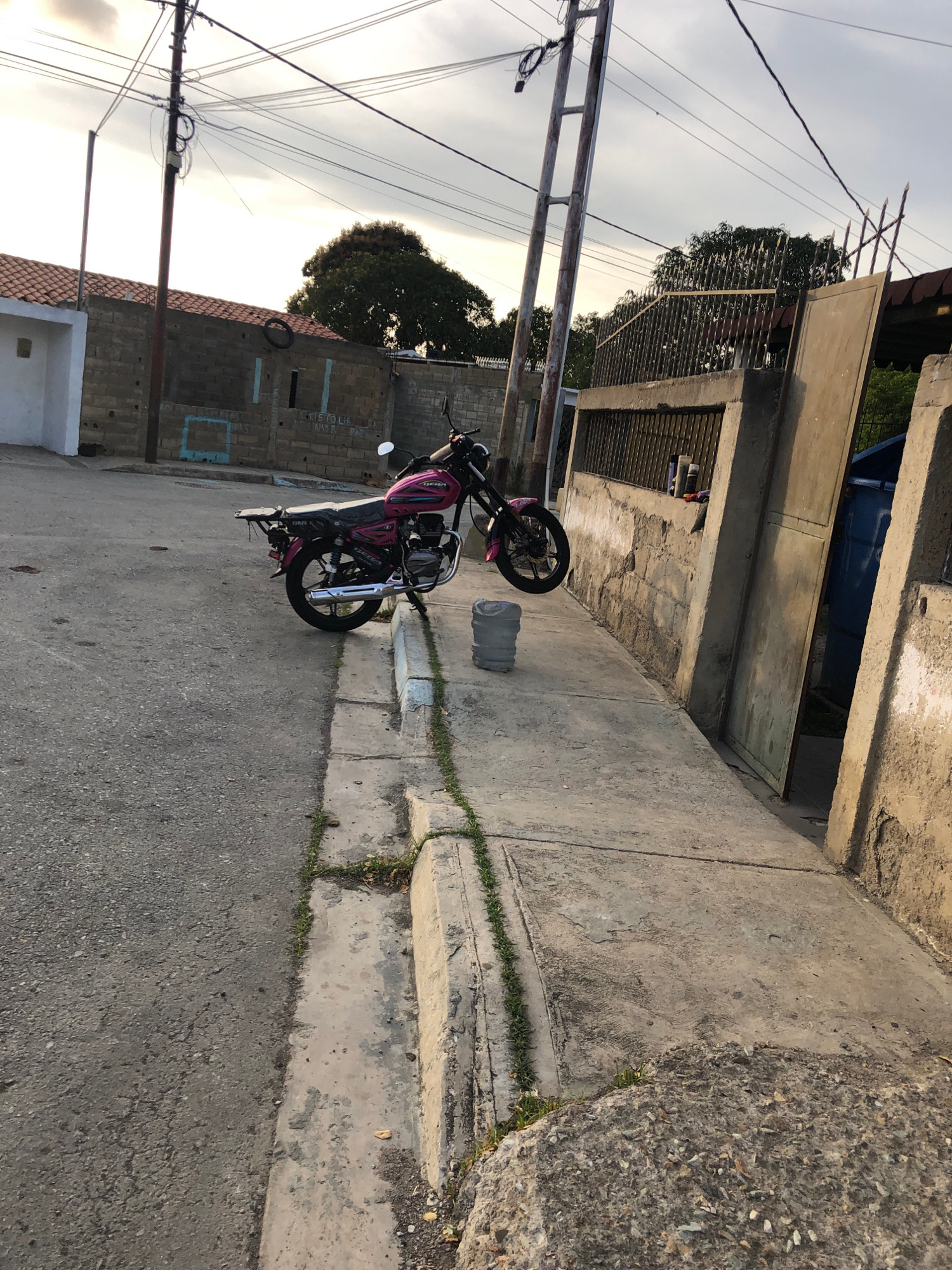 The image depicts a street scene in Altagracia, Venezuela. A pink and black motorcycle is parked on the sidewalk next to a plastic water bottle. A utility pole with numerous wires is visible on the leβ¦read more