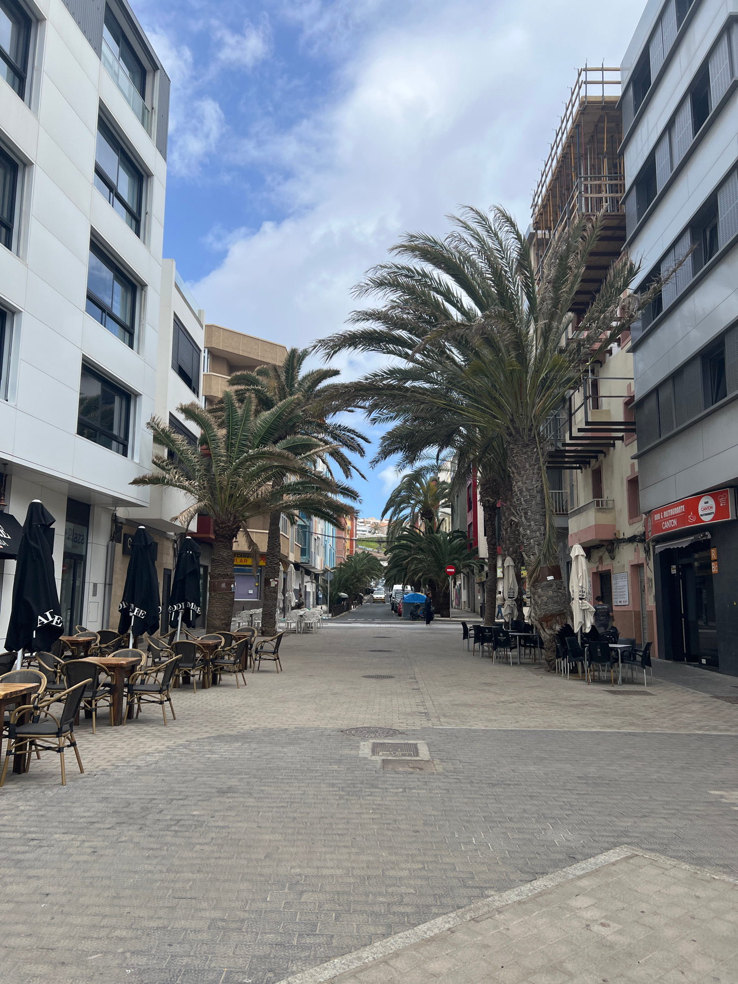 The image captures a street scene in Las Palmas De Gran Canaria, Spain. The street, paved with gray bricks, is lined with buildings of various heights and architectural styles. Palm trees are planted…read more