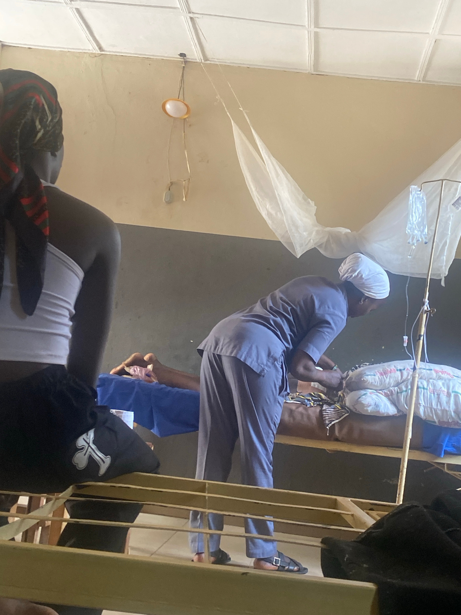 A woman in a white tank top and black wrap lies on a hospital bed in a room. A woman in blue scrubs and a white head covering stands over another bed. The scene includes hospital beds, an IV drip, andβ¦read more