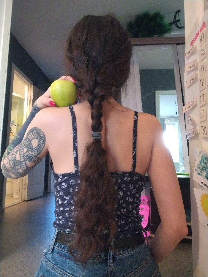 A person with brown, braided hair, wearing a floral print top and denim shorts, holds a green apple on their left shoulder. They are seen from the back, with a snake tattoo on their left arm. The back…read more