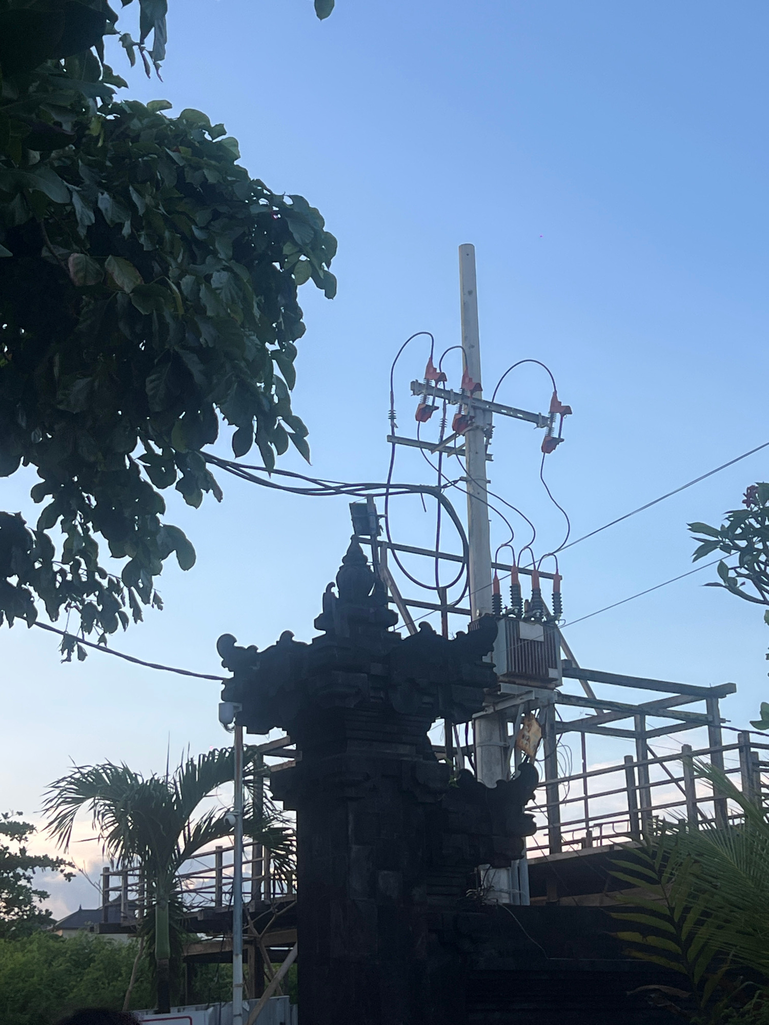The image shows an electrical pole with a transformer and related hardware, positioned near a Balinese temple structure in North Kuta, Indonesia. The scene is viewed from below, with the blue sky visi…read more