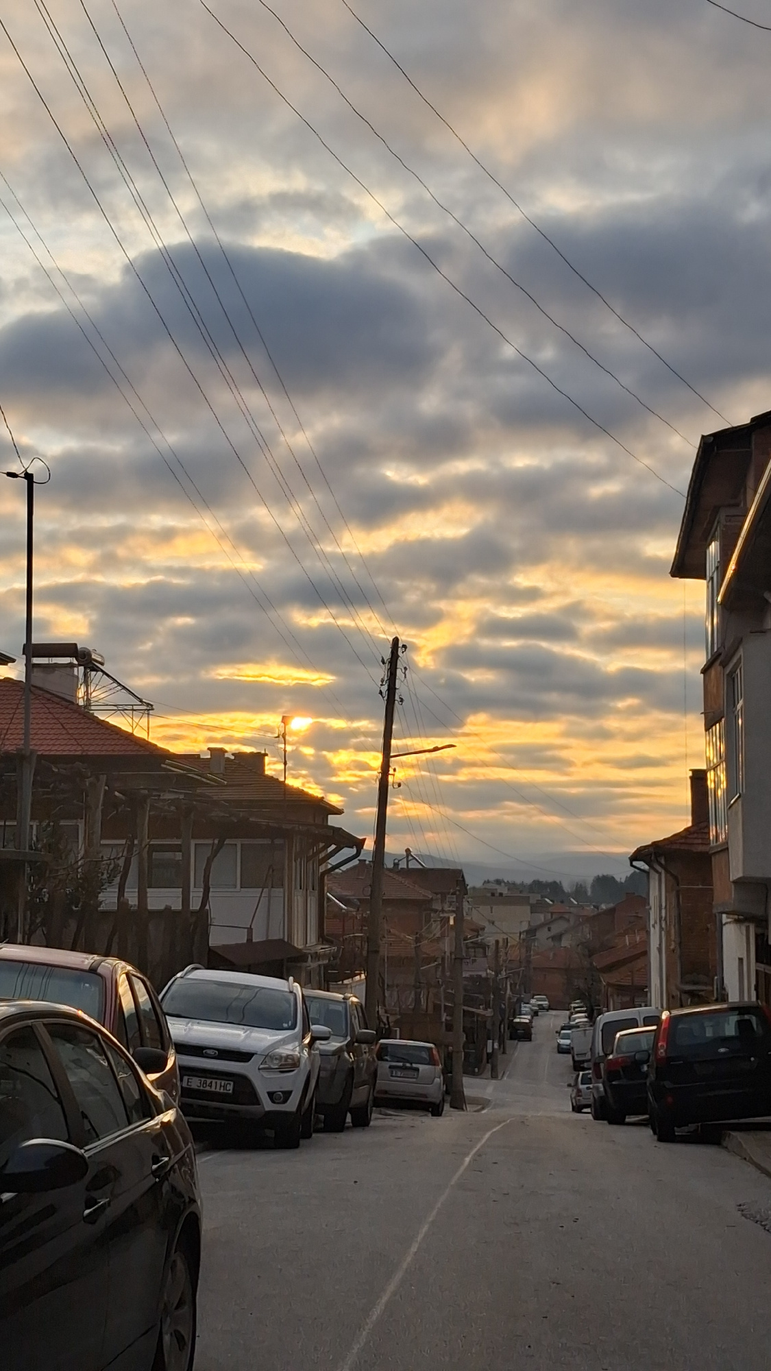 The image shows a street scene in Goce Delcev, Bulgaria. The road extends into the distance, lined with parked cars on the right. Buildings are visible on both sides of the street. A dramatic sky with…read more