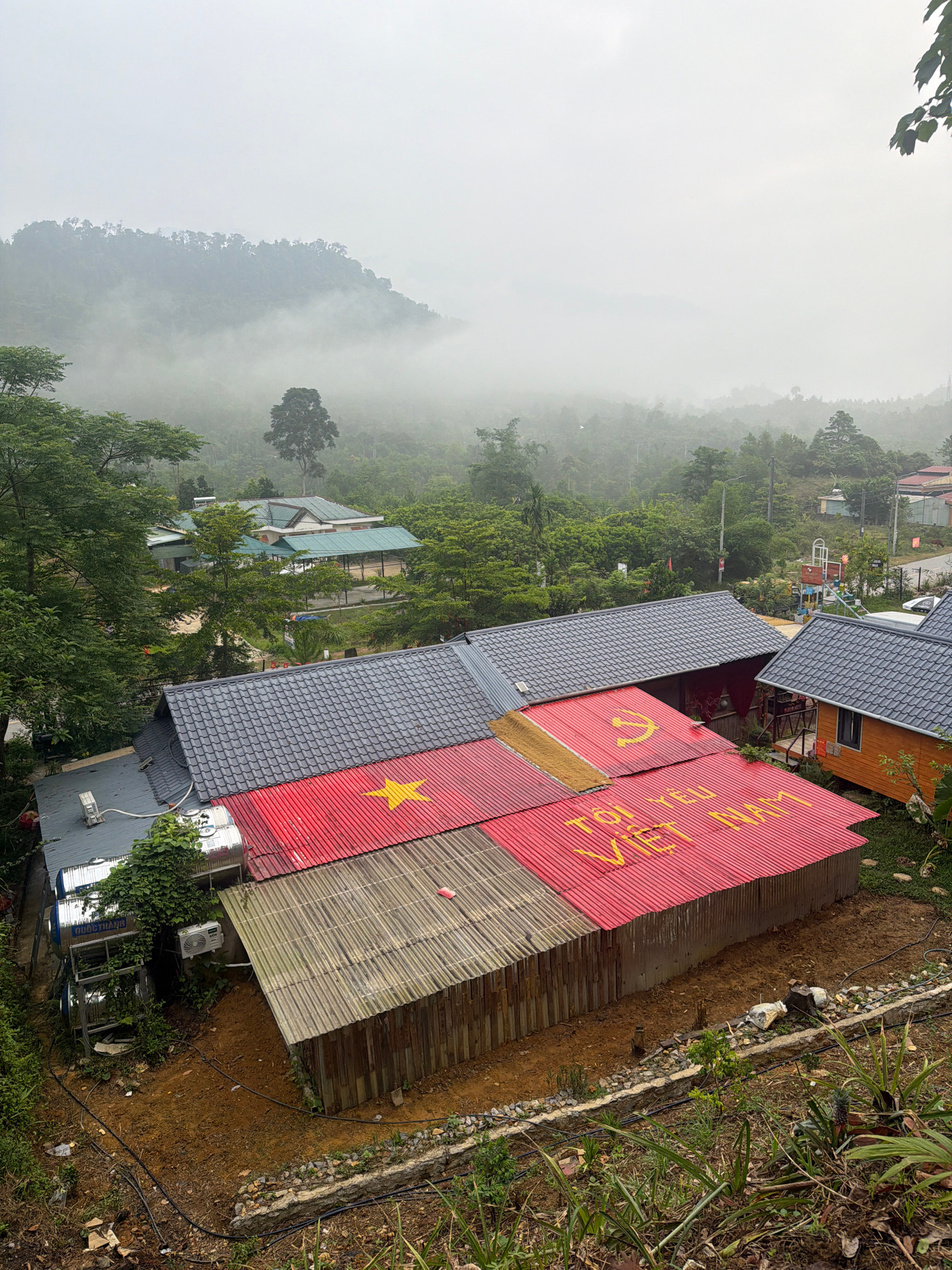 The image shows a hillside scene, likely taken from an elevated position overlooking a misty valley. In the foreground, several buildings with distinct red rooftops are visible, featuring yellow symbo…read more