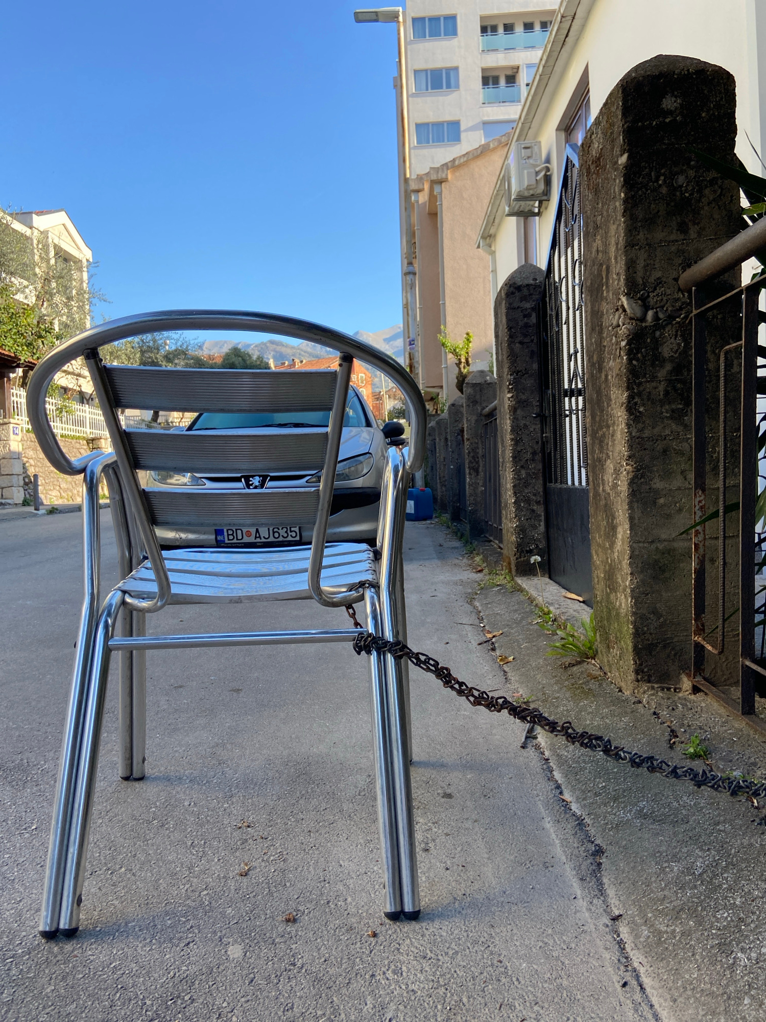 A daytime shot in Budva, Montenegro depicts a chrome metal chair on a gray concrete sidewalk. The chair obscures the rear of a silver car with license plate BD AJ635. A metal chain is attached to theβ¦read more