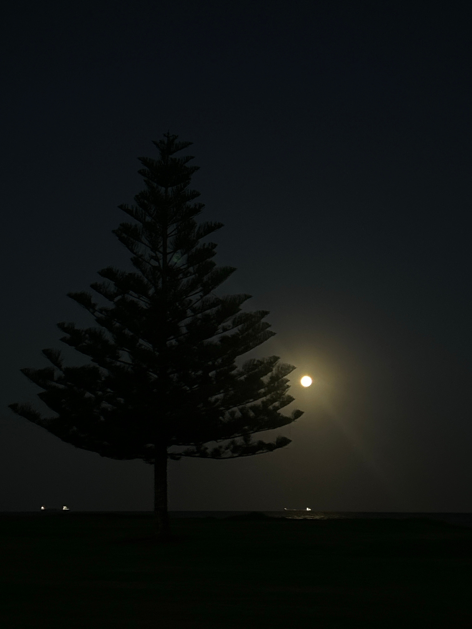 The image shows a dark night scene in Bulli, Australia. A tree with dense, triangular foliage is silhouetted against a dark sky, with the moon visible through its branches. To the right of the tree isβ¦read more