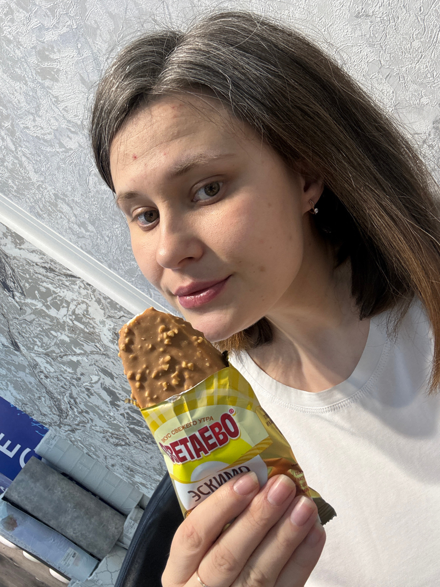 A woman is holding an opened chocolate bar in front of her. The packaging of the chocolate bar is yellow and white. The woman has brown hair with strands of gray. She is wearing a white t-shirt. The b…read more