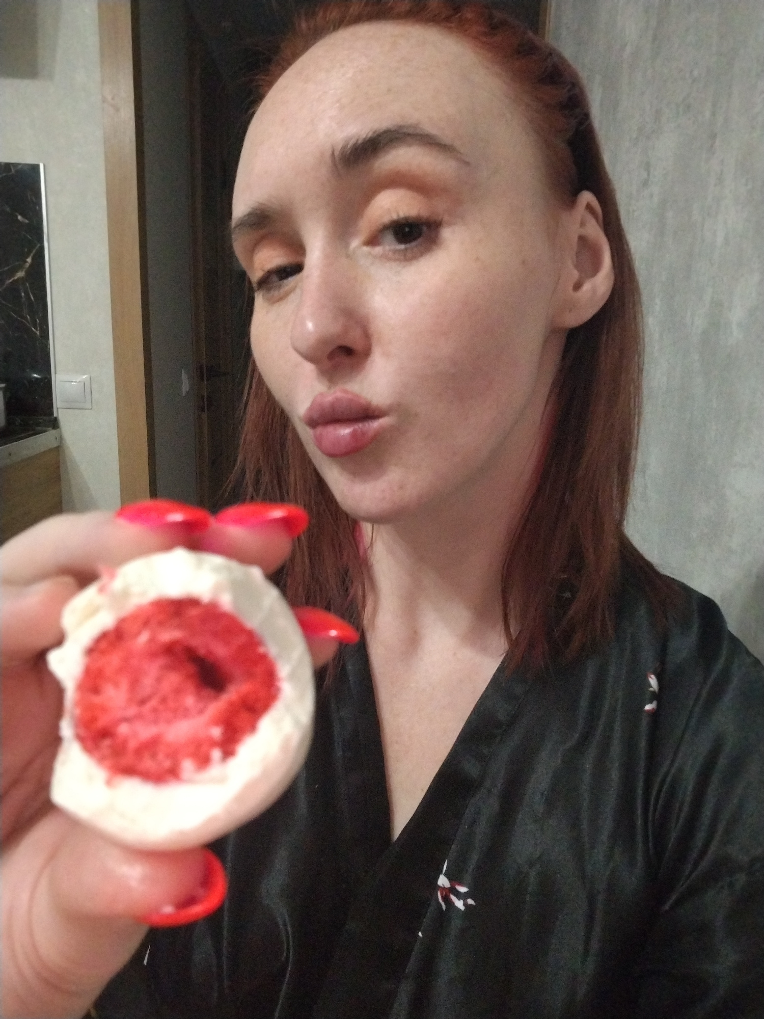 A woman with red hair and freckles is holding a bitten dessert with red filling and white frosting, positioned near her face. She has glossy lips, and her nails are painted bright red. She is wearingβ¦read more