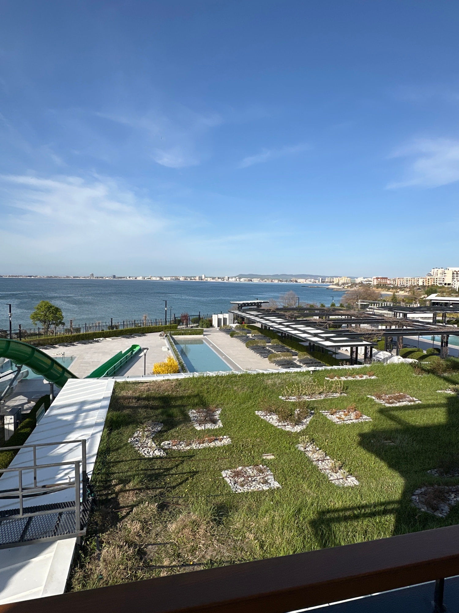 This image captures a serene coastal resort landscape, likely in Sveti Vlas, Bulgaria, under a bright, clear blue sky with sparse white clouds. The view is from an elevated vantage point, possibly a b…read more
