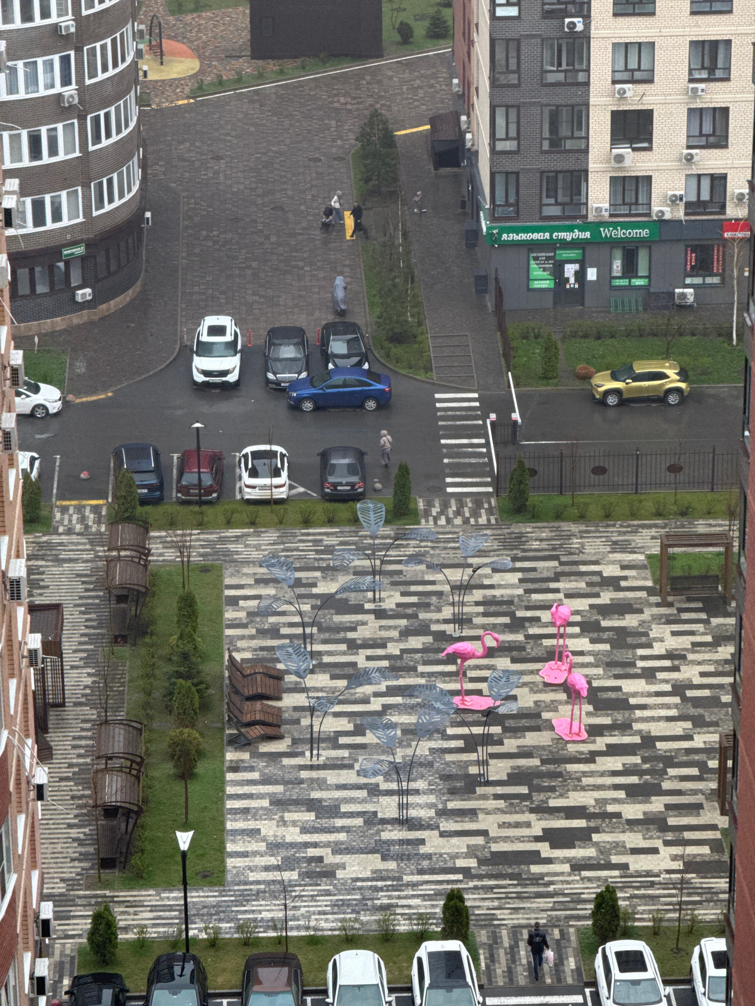 The image is an overhead view of an urban residential area, likely taken from an elevated position. The location is assumed to be Ovoshchnoy, Russia. There are several apartment buildings with varying…read more