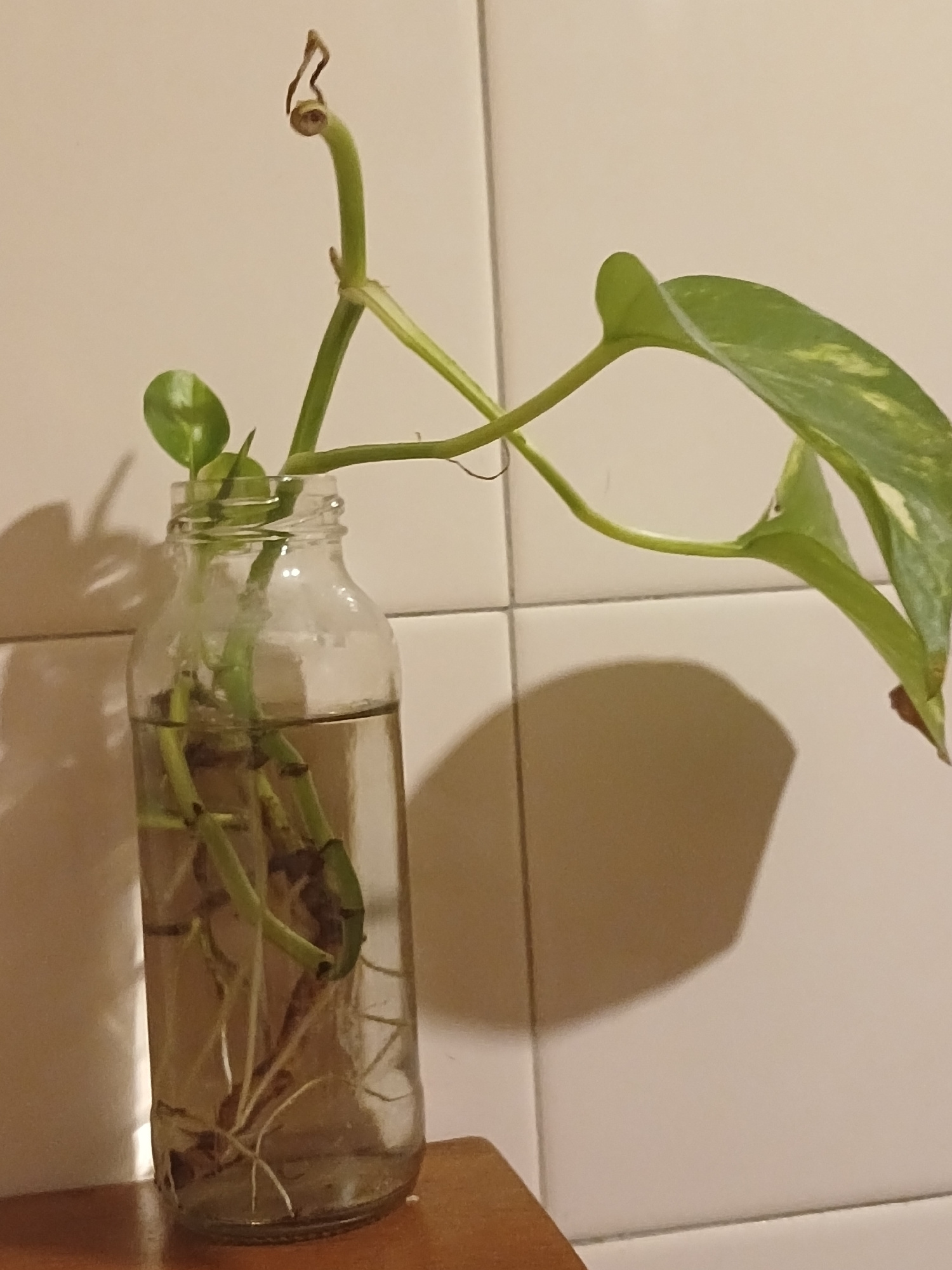 A clear glass bottle, filled with water, holds cuttings of a Pothos plant (Epipremnum aureum), which are in the process of rooting. The bottle is positioned horizontally, and the plant's variegated gr…read more