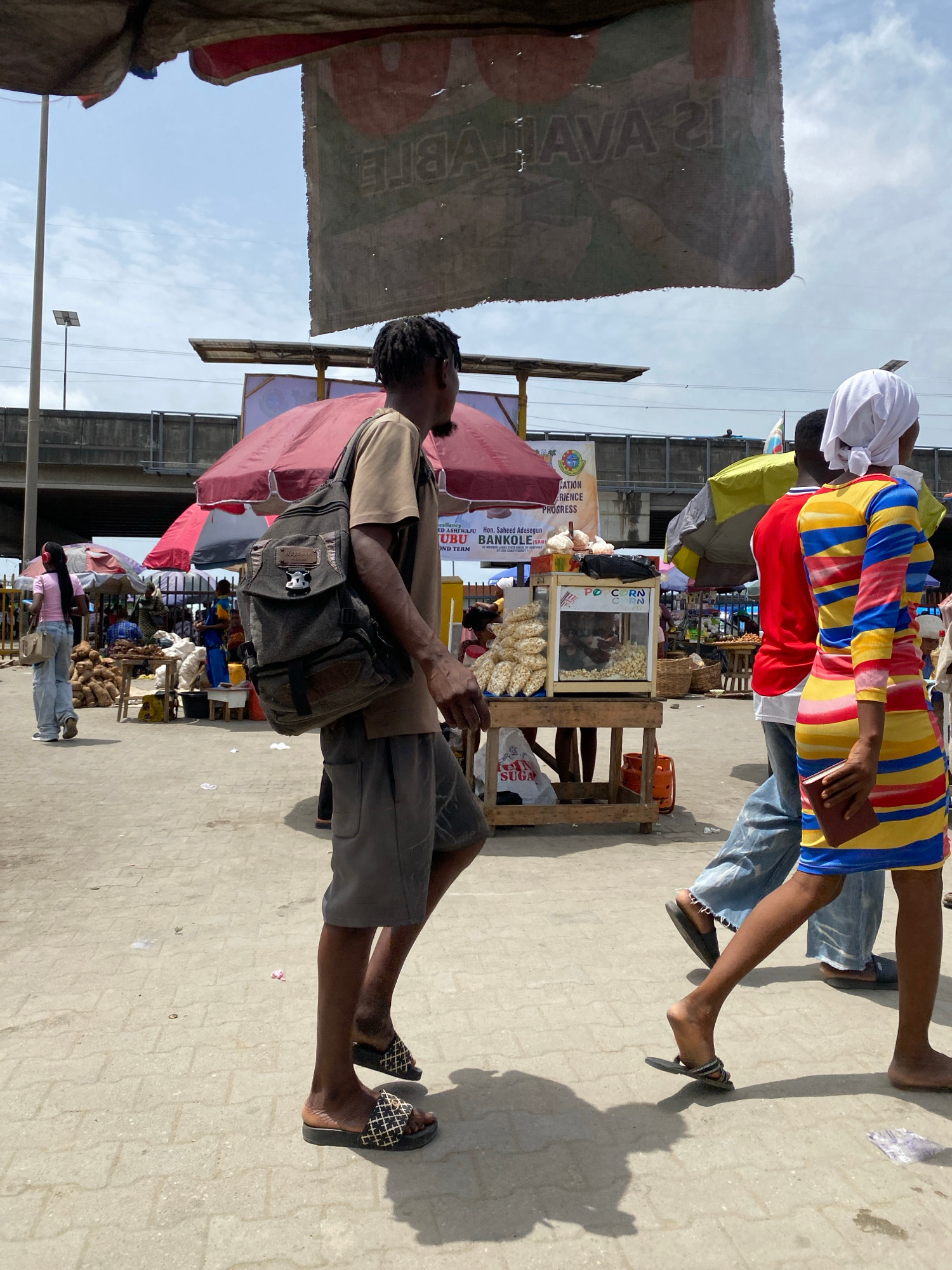 The image shows an outdoor market scene in Lagos, Nigeria. Stalls with goods such as corn and yam line a pathway. People are walking through the market, including a person in a colorful striped dress…read more